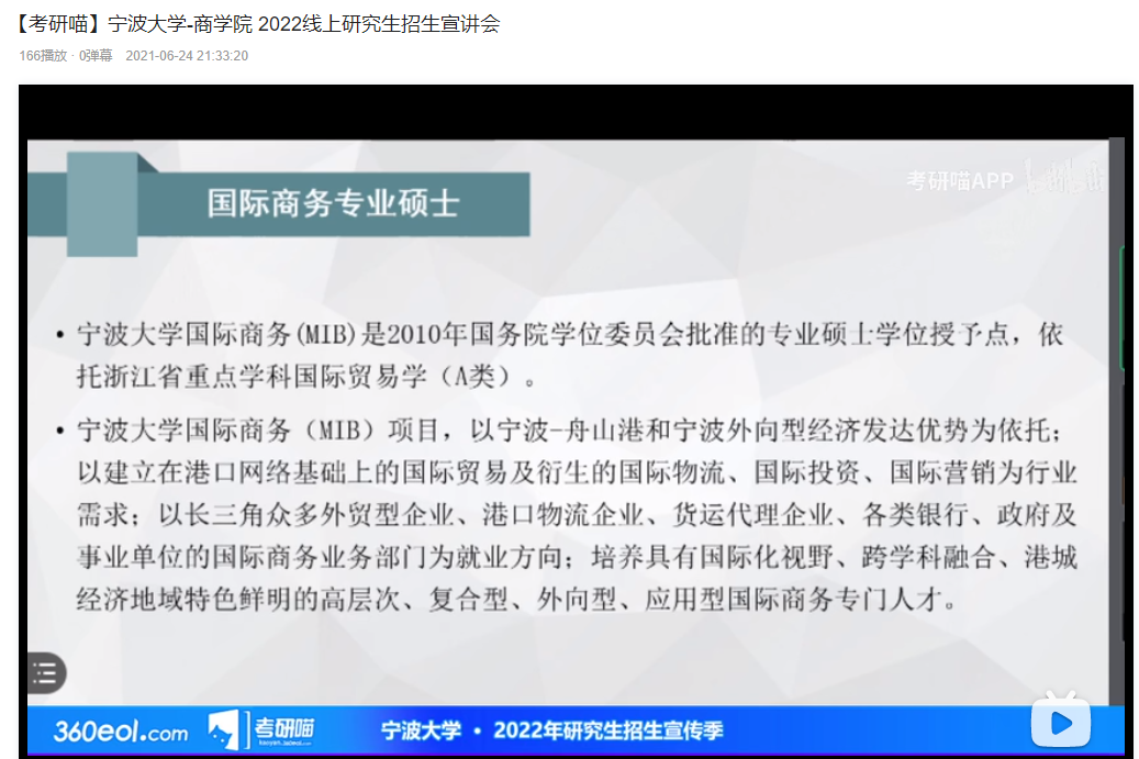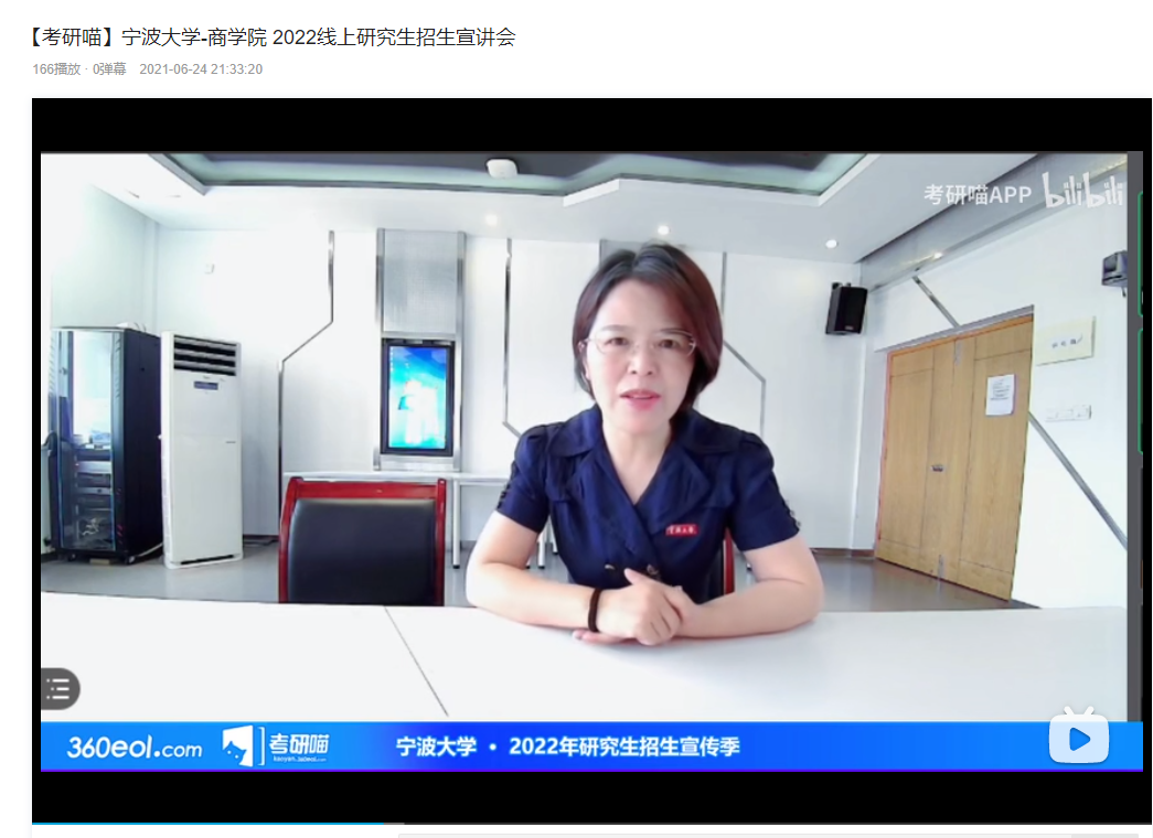 2021年6月23日,色情av影片 2022线上研究生招生宣讲会在bilibili线上平台举行。国际商务专业硕士学位点负责人杨丽华讲授参加了线上宣讲会,介绍了我校MIB项目的培养目标、特色及专业建设情况。