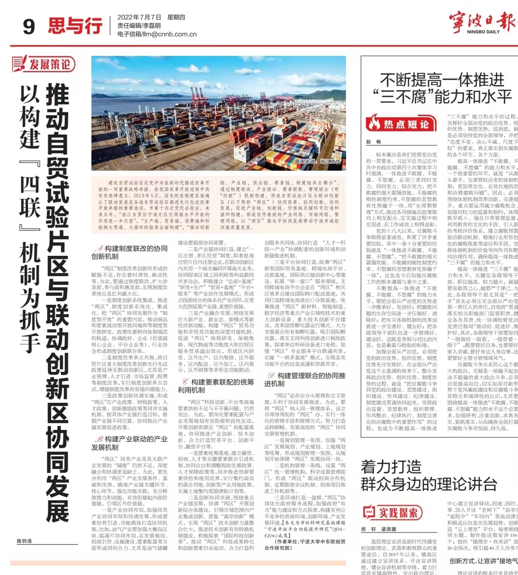 1.陈钧浩,“以构建‘四联’机制为抓手,推动自贸实验片区与联动创新区协同发展”,《宁波日报》2022年7月7日,“思与行”(第9版)。