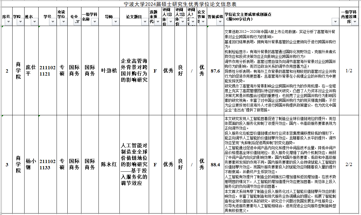 3月24日,色情av影片 研究生院公示“色情av影片 2024届研究生优秀学位论文”评选结果名单,我校2021级MIB学生庞仕平、杨小刚两位同学的学位论文获评校级优秀论文。