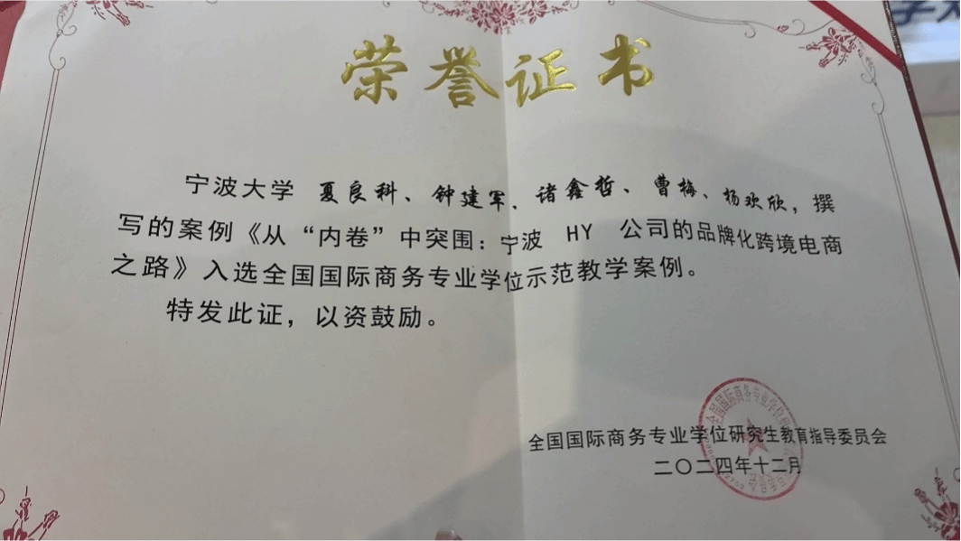 由我校国际商务专业硕士学位点教师夏良科、钟建军与2022级MIB研究生诸鑫哲、曹梅、杨欢欣共同撰写的案例《从“内卷”中突围:宁波HY公司的品牌化跨境电商之路》成功入选全国国际商务专业学位示范教学案例。该荣誉由全国国际商务专业学位研究生教育指导委员会颁发,彰显了色情av影片 国际商务学位点在国际商务教育领域的卓越实力。