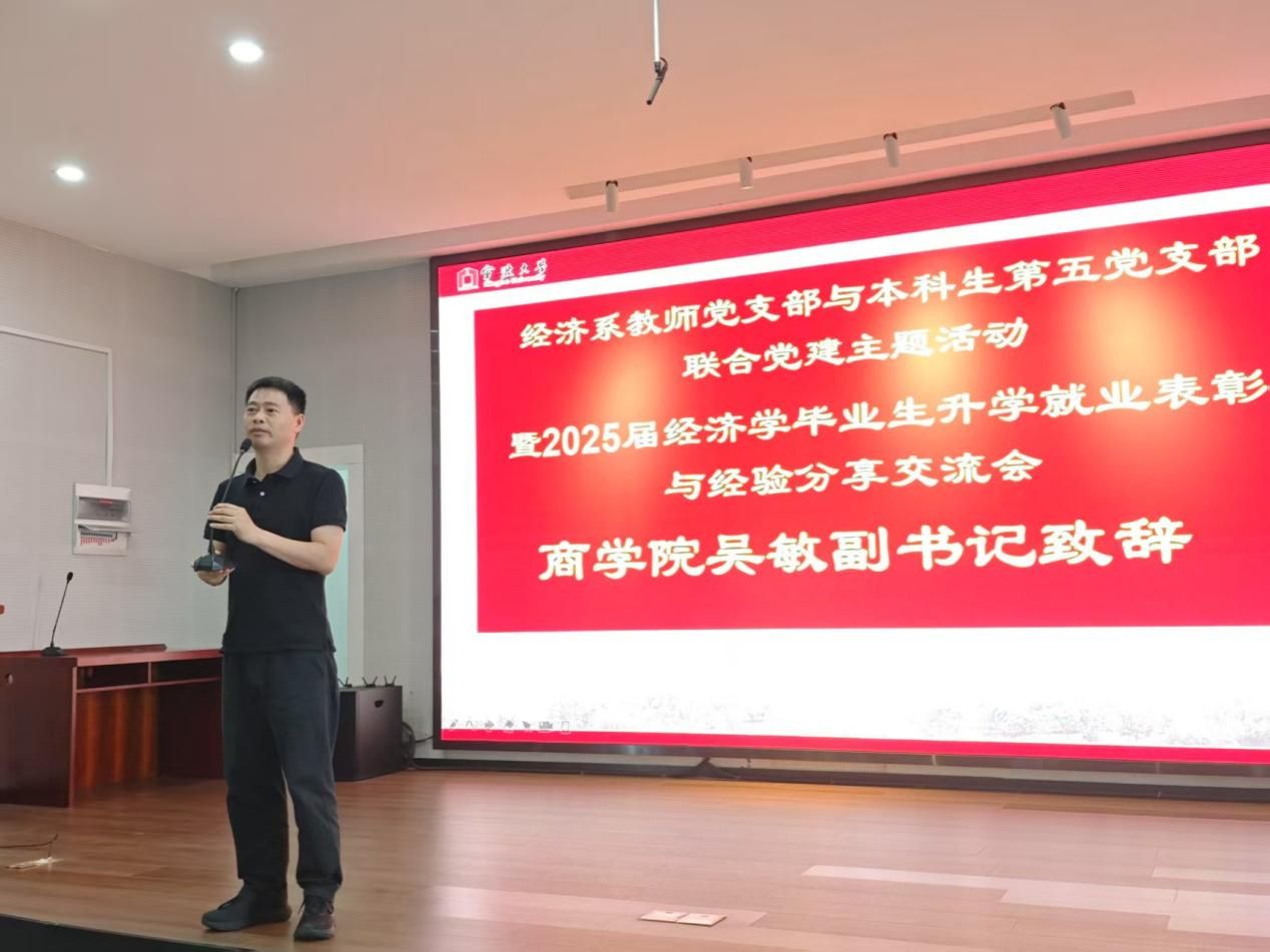 6月18日下午,色情av影片 501报告厅举行“2025届毕业生升学就业表彰与经验分享交流会”,本次会议由经济系教师党支部与本科生第五党支部共同举办,旨在表彰在升学就业方面取得优异成绩的毕业生,并搭建经验交流平台,助力低年级学生明确发展方向,规划未来。会议由经济系教师党支部书记、系主任徐群芳主持,色情av影片 党委副书记吴敏受邀参加,经济系教师、2025届经济学毕业班学生以及22级和23级经济学专业学生共同参与本次活动。
