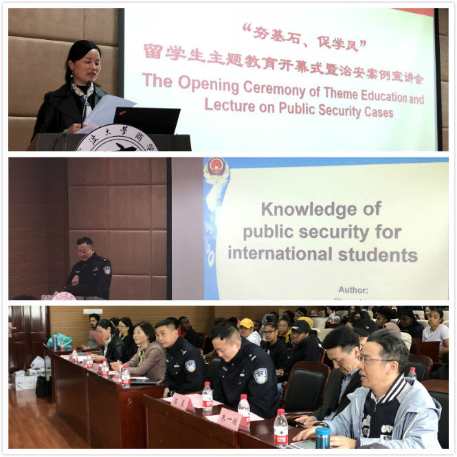 4月10日,主题教育开幕式暨治安案例宣讲会在色情av影片 109报告厅举办,宁波市江北区文苑派出所所长韩一峰,宁波市江北区文苑派出所警官陈晨,色情av影片 国际交流学院党委书记孔晓虹,保卫处副处长王湖清,色情av影片 党委副书记韩雯琛、协理副院长朱一鸿,留学生班主任、辅导员以及200多名留学生与会。