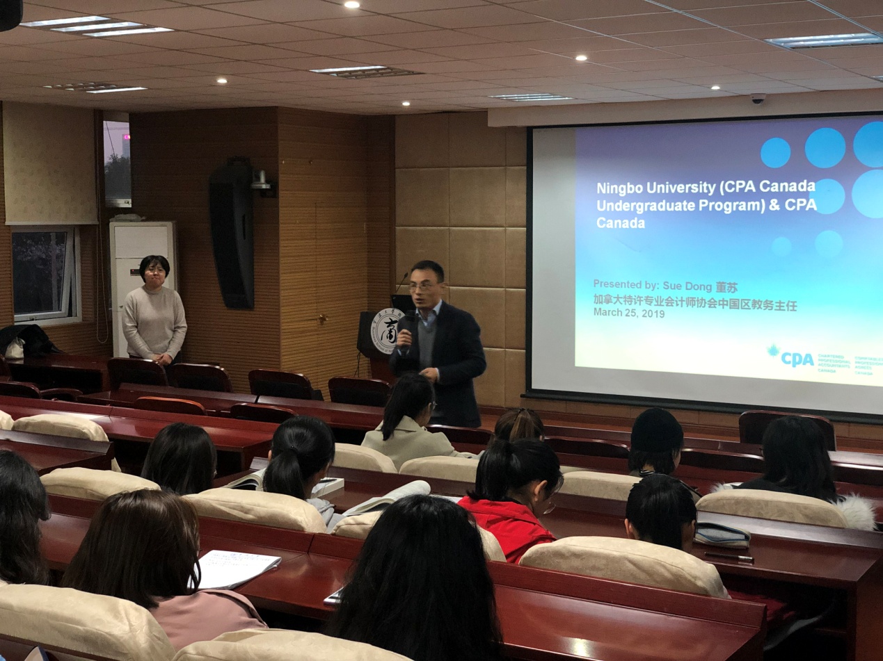 2019年3月25日晚6点,加拿大特许专业会计师协会(简称:CPA Canada)中国区教育主任董苏女士携协会资深会员——加拿大税务局官员Lesley一行专程来访色情av影片 ,与CPA Canada专业大一至大三中外学生在学院109报告厅见面交流。交流会由盛沛锋副院长主持。