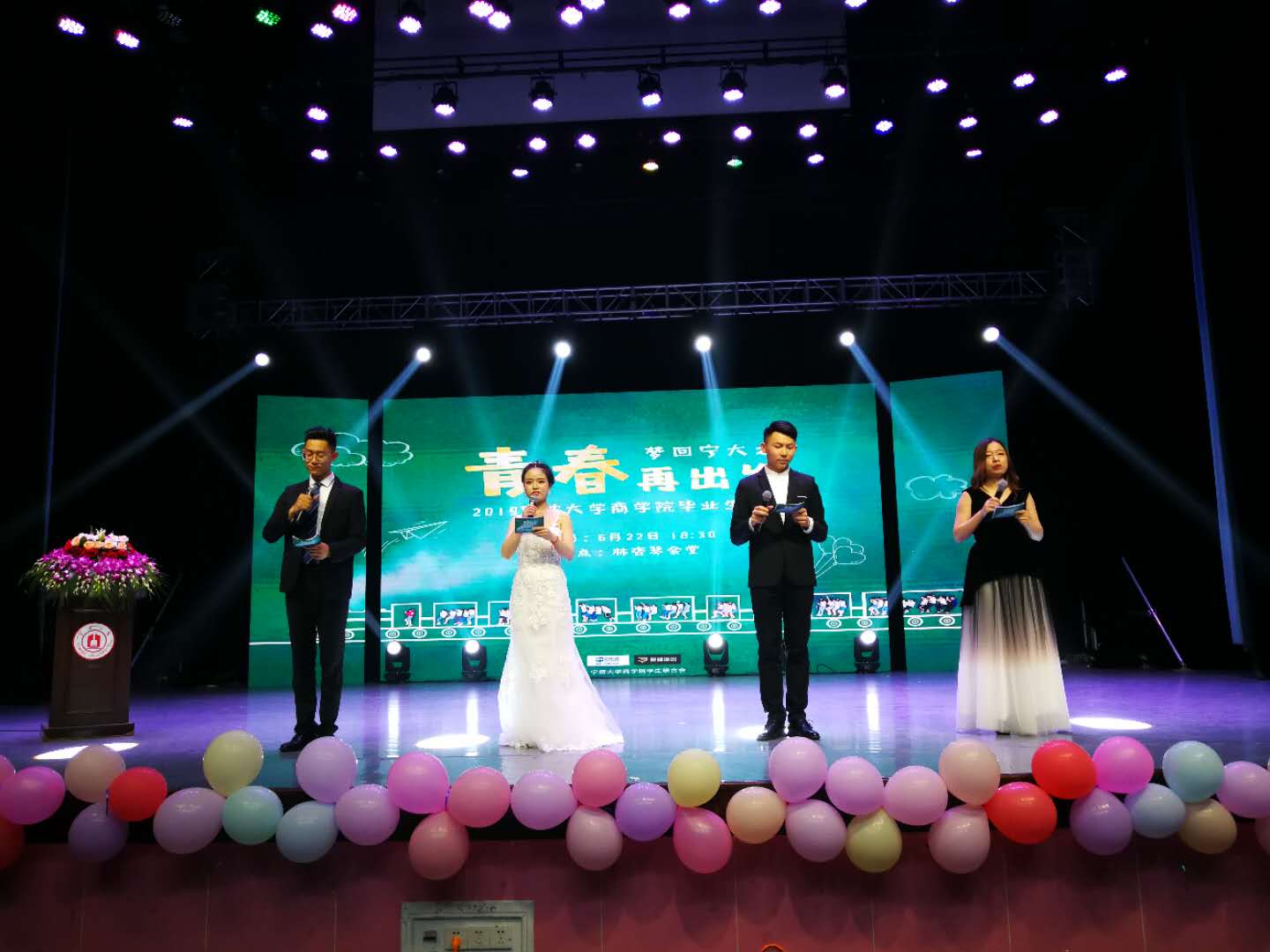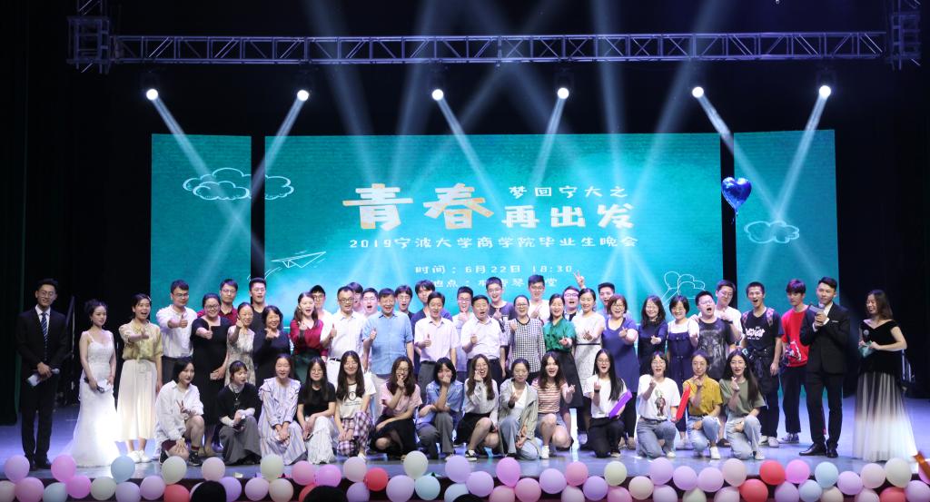 6月22日晚,色情av影片 在林杏琴大会堂举办 “梦回宁大之青春再出发”2019届毕业晚会。院长金祥荣,院党委书记史宏协,副院长盛沛锋、周新苗,院党委副书记韩雯琛,系主任熊伟清,毕业班班主任钱树静、杜琳,还有长期以来关心学生成长的应志芳、张云华、程永毅老师,院办、科研办、教务办、学工办等老师,及600余名毕业学子共同参加了此次晚会。