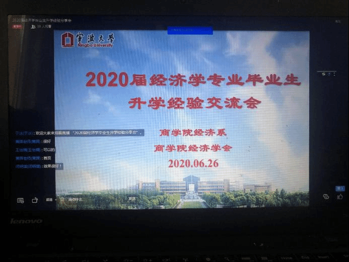 经济学作为经济类学科的基础专业,读研一直是学生的重要选择。在学院的支持和关怀下,经济系逐步建立起了考研留学指导制度,并于2019年底专门成立了经济学会学生社团,通过不定期活动分享考研信息和经验,激发学生考研和留学的兴趣。在学院和经济系老师的大力支持下以及班主任闭明雄老师和经济学会指导老师的共同努力下,今年的升学工作取得了喜人的成绩。2020届经济学专业毕业生36名,其中国内读研6人,出国留学5人,升学率达到31%,创历史新高。在毕业生即将离校之际,经济学会于6月26日下午组织了一场升学经验交流会,分别由2020届本专业毕业生中成功考研和出国留学的优秀学生向2017级和2018级有志升学的学弟学妹们分享奋斗的经验。本次交流会由经济学会负责人、2017级经济学专业班主任于冰主持,经济系教学系主任黄晖和2016级班主任闭明雄全力协调。由于正值毕业生离校之际,又是端午假期,本次交流会采取灵活的钉钉直播的方式开展。为了使同学们能熟练运用钉钉直播,于冰老师花费了大量的时间给学生一对一地指导,从而确保了交流会顺利地进行。