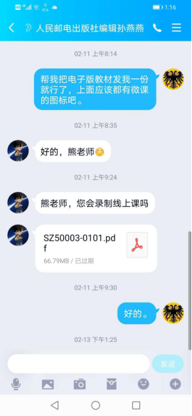 线上教学的学生没有教材,熊乐星老师主动联系出版社编辑,组织教材电子文档和相关教学视频。按课程组建教学群,联系所授课程两个班级的班长将两个教学班所有学生都分别拉进教学群,将电子教材及时通过教学群发送给学生们,以便学生提前做好准备来适应线上教学这一新的教学模式 。