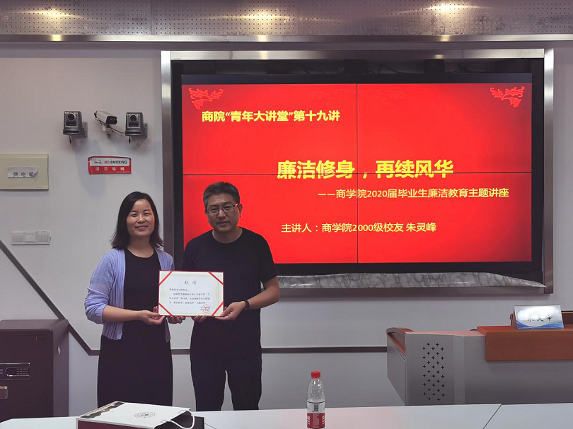 6月22日晚,色情av影片 邀请2000级国贸系校友朱灵峰做客商院“青年大讲堂”第十九讲,在商院414为2020届毕业生做“廉洁修身,再续风华”主题讲座,色情av影片 党委副书记副书记韩雯琛、工商系教师朱福建、学工办周双双、钟冬冬以及40余名毕业生现场参加了此次活动,本次活动同步线上钉钉直播,近200名毕业生线上观看。