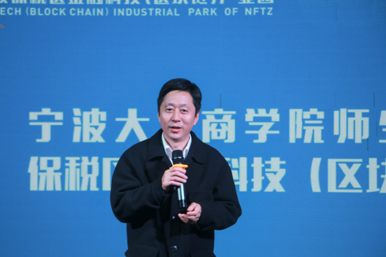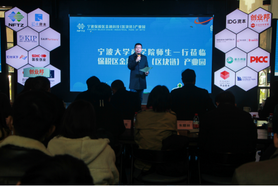 第一环节在宁波金融科技产业园的介绍短片中拉开帷幕。陆主任首先对宁大色情av影片 师生的到来表示热烈欢迎。随后介绍了保税区的发展史及目前在国际贸易、出口加工、保税仓储以及数字经济四大领域发展现状。保税区成立近30年,共5.3平方公里,经过历代保税人共同努力已经取得了不小的发展,保税区有限空间里要实现无限的发展,用新技术赋能传统产业转型升级,提高亩均产出,探索发展以数字经济为代表,包括金融科技、区块链、新经济、新业态、新模式,给予我们新的区域经济增长点。陆主任还殷切希望,未来园区与色情av影片 开展深度合作,双方发挥各自优势,共同推进产学研协同创新和人才协同培养,实现共赢。