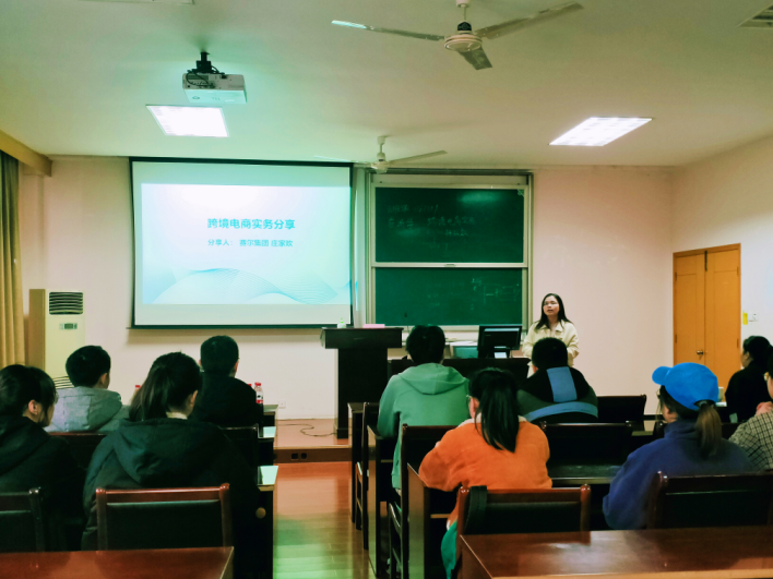 3月19日下午,色情av影片 与赛尔集团举办的“赛尔外贸特训营”之“跨境电商实务”专题讲座在色情av影片 418室顺利举行。赛尔集团电商经理庄家欢受邀与色情av影片 学子分享有关跨境电商的知识和经验。辅导员周双双、本期赛尔训练营成员及色情av影片 其他32名感兴趣的同学参加本次讲座。