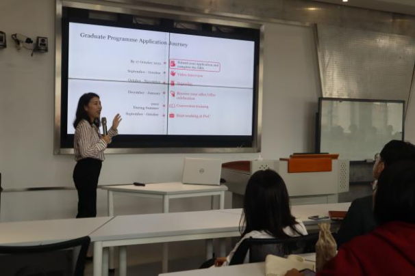 乐乐向同学们详细讲述了面试流程、网申通道等等,同时列出了有关面试的关键时间节点,除此之外,她还介绍了普华永道在杭州和宁波等各地的办公室,讲解了内部大概的业务分工、项目构成以及客户种类等。