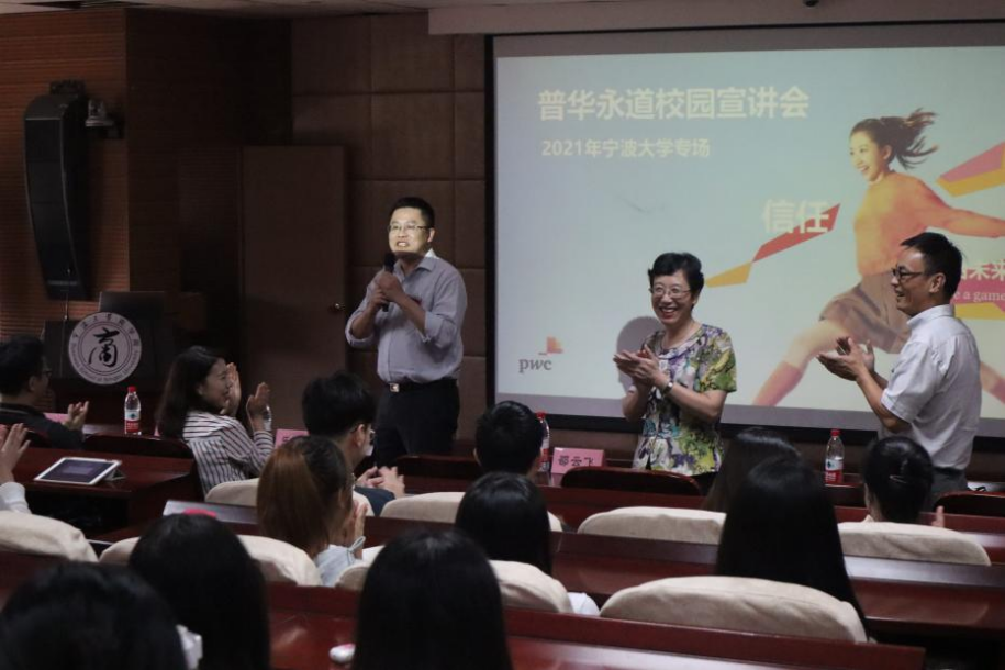 最后进入了轻松活跃的现场提问环节。邵云飞等人作为嘉宾,耐心解答了学生们的提问。同学们的问题精彩纷呈:“非会计专业的学生能否应聘普华永道的审计岗位?” “招聘的名额情况” “宁波的岗位是否有线上面试?” “大学里考取专业相关的证书有什么优势?”……嘉宾们也为现场的学子们给出了详细的解答和中肯的建议。