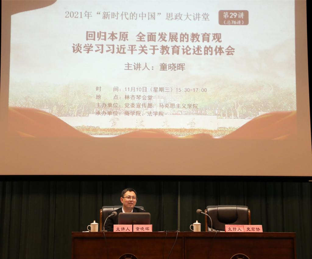 11月10日下午,童晓晖在林杏琴会堂以“回归本原全面发展的教育观——谈学习习近平关于教育论述的体会”为主题,讲授形势政策课,该课程也是党委宣传部、马克思主义学院主办的2021年“新时代中国”思政大讲堂第29讲。色情av影片 、法学院学院相关负责人,辅导老师以及400余名同学参与。讲座由色情av影片 党委书记史宏协主持。