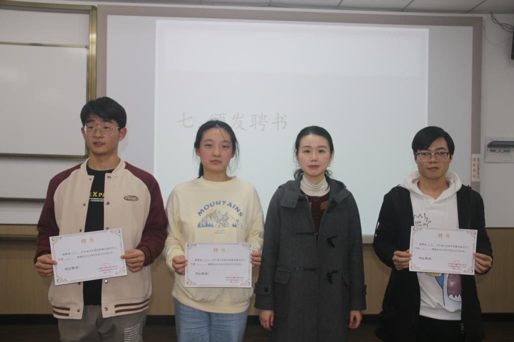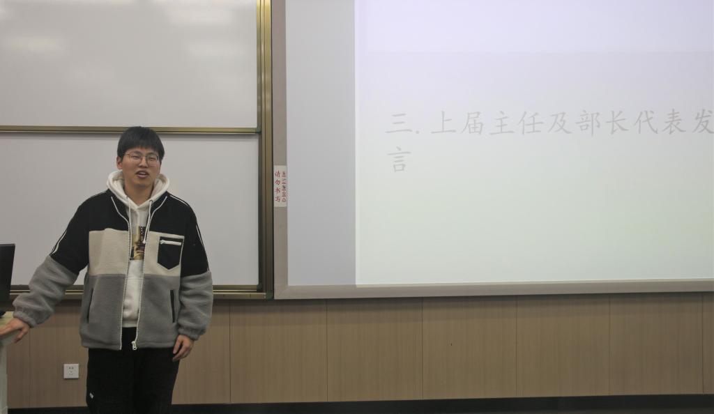 时熠、沈佳仪、王昊泽为各位部长颁发了聘书,并邀请部长们上台发言。各部长总结了半个学期以来各部门的工作,对干事们的辛勤付出表示了感谢,同时也对部门未来的发展方向提出了自己的见解。紧接着,各部长向干事们颁发了聘书。采编部干事应紫涵作为干事代表发言,她认为风华工作室氛围自由且活跃,在运动会实地采访与风华开放日的活动中,她的采访与稿件撰写能力有所提升,也希望未来能拥有更多与优秀者交流的机会。