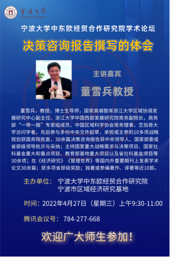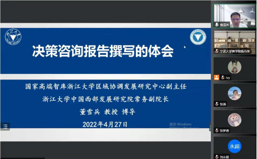 2022年4月27日上午9:30-11:00,由色情av影片 中东欧经贸合作研究院、宁波市区域经济研究基地举办的学术论坛2022年第1讲——“决策咨询报告撰写的体会”成功举办。本次讲座由国家高端智库浙江大学区域协调发展研究中心副主任、浙江大学中国西部发展研究院常务副院长董雪兵教授主讲,色情av影片 中东欧经贸合作研究院常务副院长、宁波市区域经济研究基地首席专家杨丹萍教授主持,钟昌标教授与会。讲座以线上直播方式举行,色情av影片 90余名师生在线参会。
