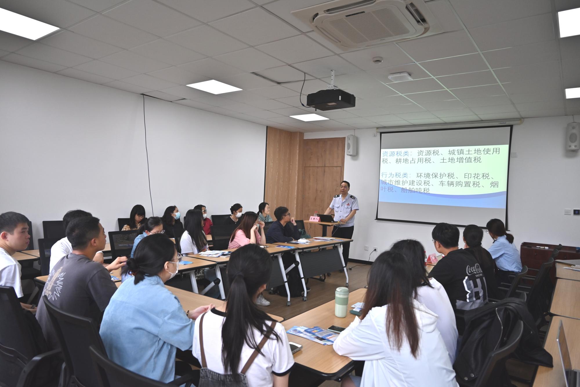 首先进行“助力大学生就业创业税费服务站”授牌仪式。随后,方锐围绕“大学生就业创业税费”主题,为在场的毕业生带来了一堂廉洁从业的思政课。方科长介绍了增值税、消费税、企业所得税、个人所得税等各项税种,用生动的案例让同学们感受到税费制度与每个公民的息息相关。方科长把税法普法与税收宣传相结合,不仅拓展了同学们的知识面,更让依法诚信纳税的观念深入人心。
