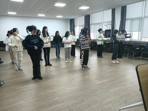 形体培训中,王如意细心教授站姿,走路姿势等相关形体知识,同学们认真学习并进行实践练习。