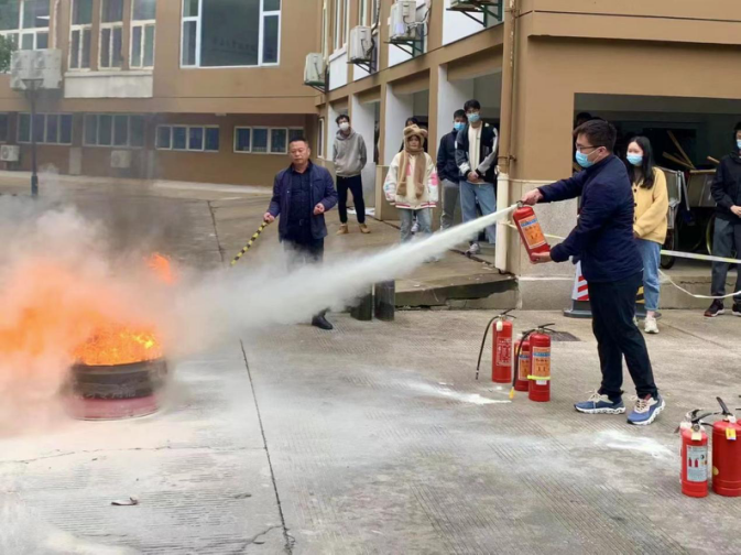 为了使同学们更好理解灭火器的使用方法,现场准备了柴油桶、柴油等道具。郑永辉在演练道具柴油桶中倒入水和柴油,随着火焰的燃烧,郑永辉使用灭火器亲自为大家进行了示范,并详细向现场的同学们讲解了灭火器的构造、使用方法和操作步骤。在随后的模拟演习环节中,在场的同学们积极参与到实践中,亲自上手使用灭火器,体验灭火过程。本次演练的同学们都表示受益匪浅,并表示到将把自己所学的消防知识传授给班级同学。