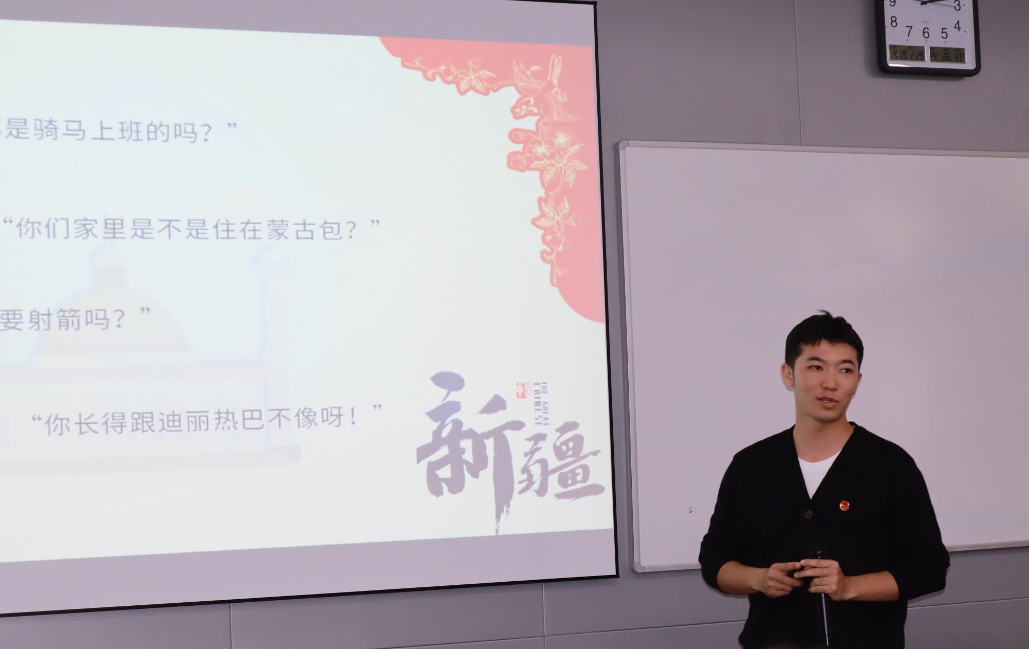 讲座伊始,“飞越”甬疆实践宣讲团指导老师麦尔阿巴结合自身例子介绍新疆部分少数民族姓氏组成、在新疆内地高中班的学习经历,并分享了自己对于民族团结的理解。