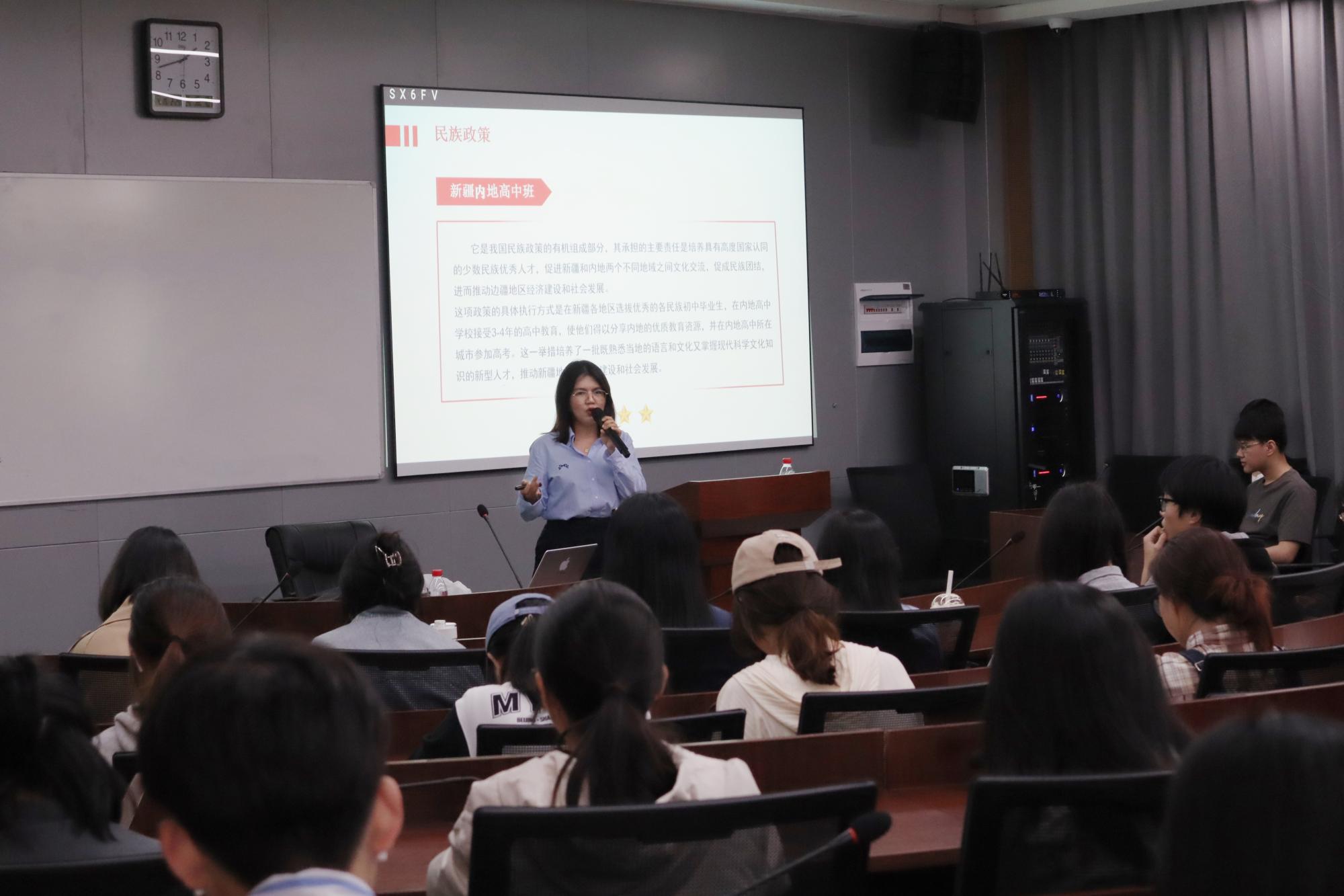 讲座第二部分以“飞越‘甬疆’,共画同心圆:探寻民政团结答案”为主题,由“飞越”甬疆实践宣讲团队长戴秉邦讲述。戴秉邦以“大美新疆”宣传片导入,用有奖竞答援疆知识活动充分调动了现场的氛围和激发了同学们的兴趣。