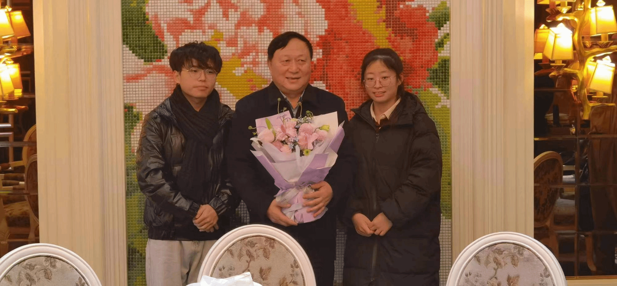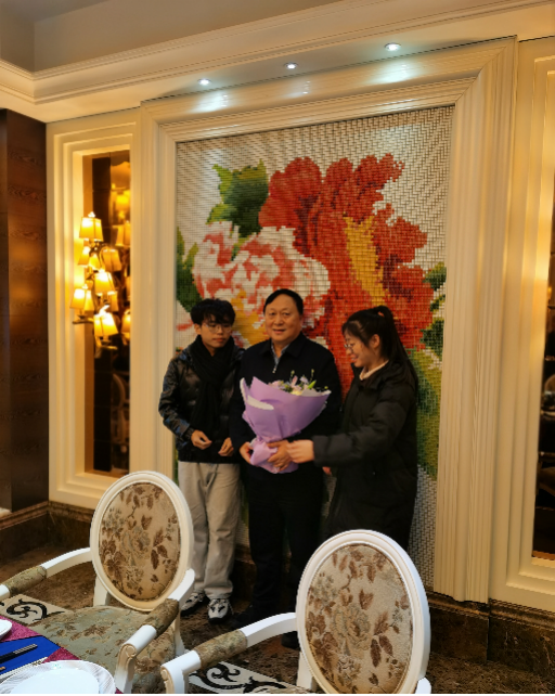 随后,两位受助学生代表与陆汉幸先生一同前往酒店参加生日聚餐。在现场,两位同学在陆汉幸先生亲朋好友的祝福声中为陆董送上鲜花和蛋糕,并代表学院老师以及“宏达奖助学金”全体受助学生向陆董表达了真切的生日祝福。