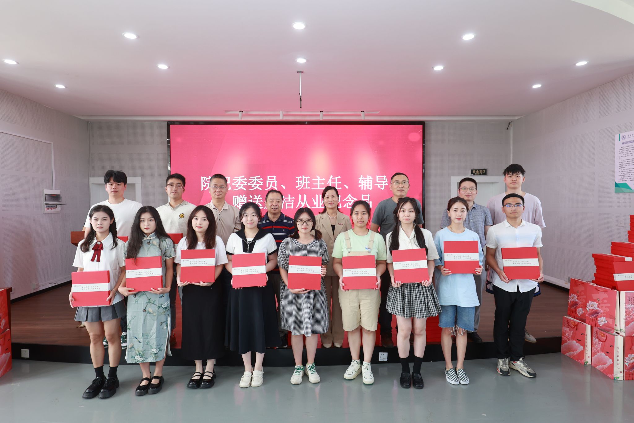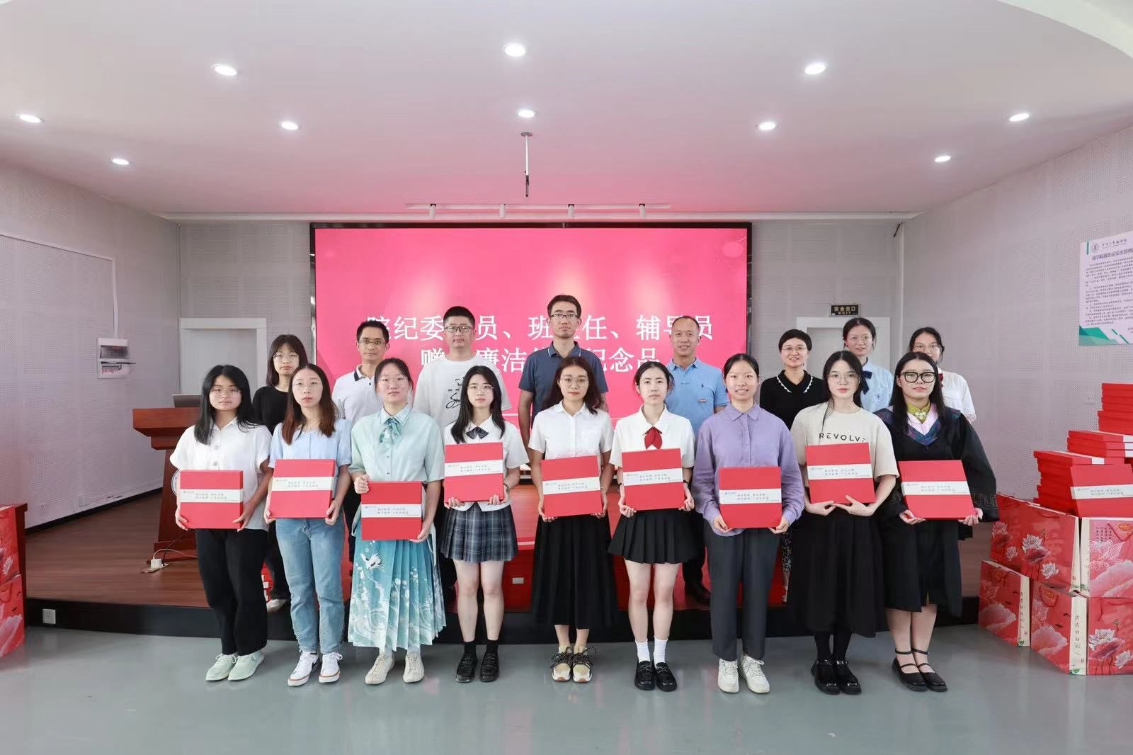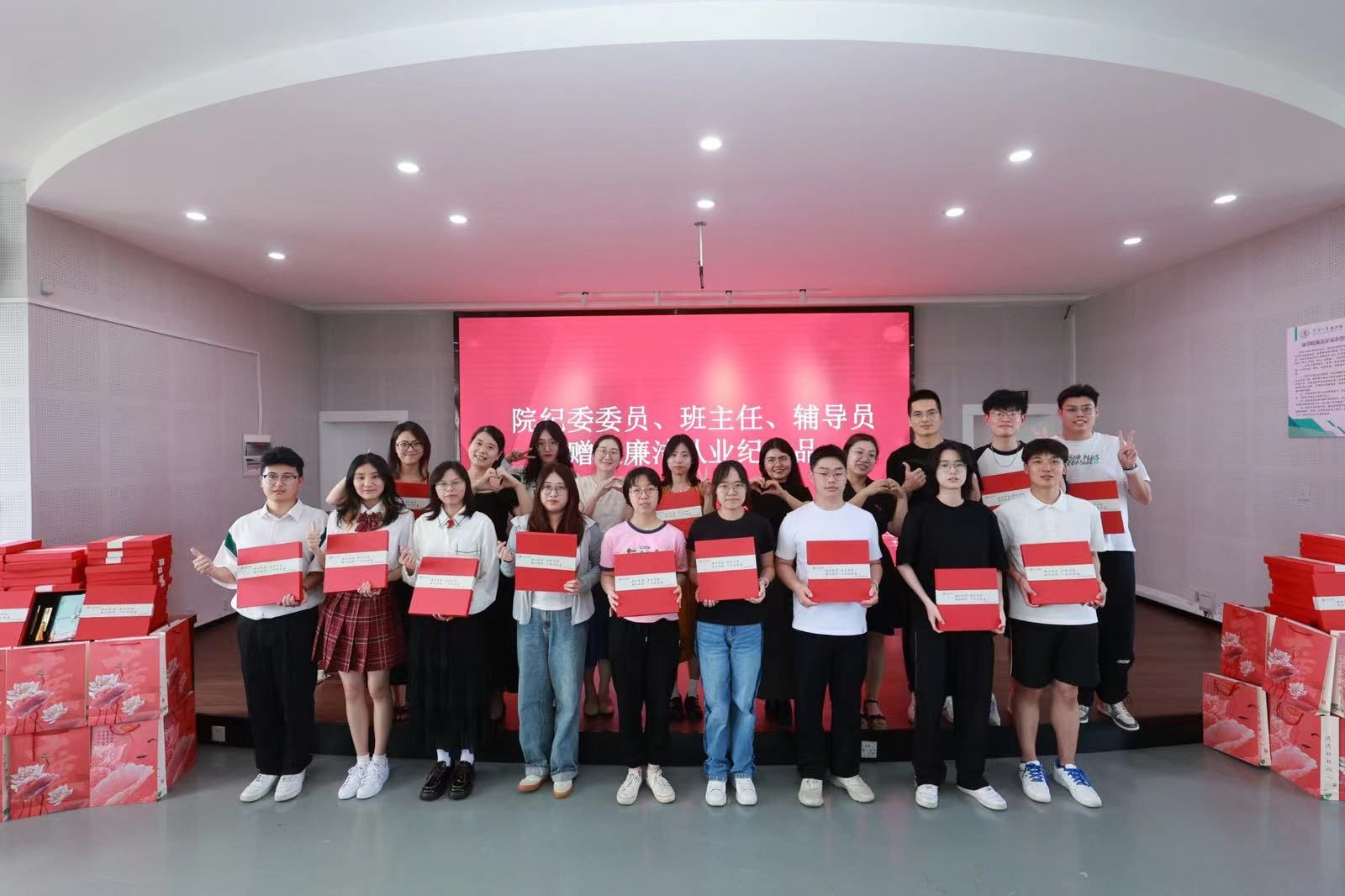 在这场特别的思政课上,学院为毕业生党员送上了一份精心准备的纪念品套盒,其中包含一本扣上廉洁从业扣子的书套,里面印有习近平总书记对青年的廉洁语录,指引毕业生们沿着正确的方向追求梦想;一枚戒尺,心中有尺,行事有度,尺上刻有“廉洁相伴,一生无憾”;一支檀木笔,叮嘱大家下笔清晰有力,堂堂正正做事,书写自己的灿烂人生。这一套盒由学院纪委委员、班主任和辅导员分别颁发给活动现场的每一位毕业生党员,表达学院领导和老师对毕业生们的深切祝福和殷切期待。