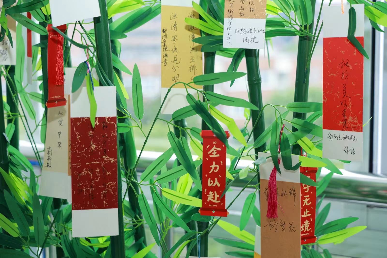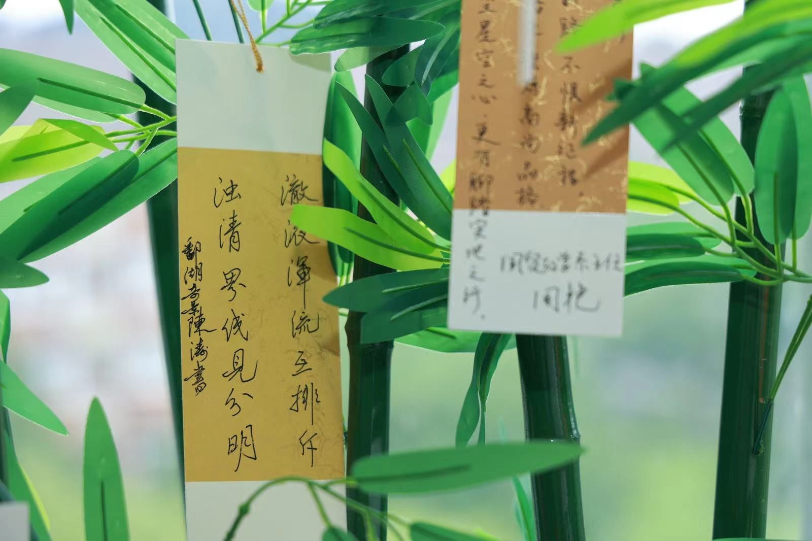 师长赠“廉”,竹叶上挂满了廉洁书签,毕业生党员任意挑选,领取收藏。