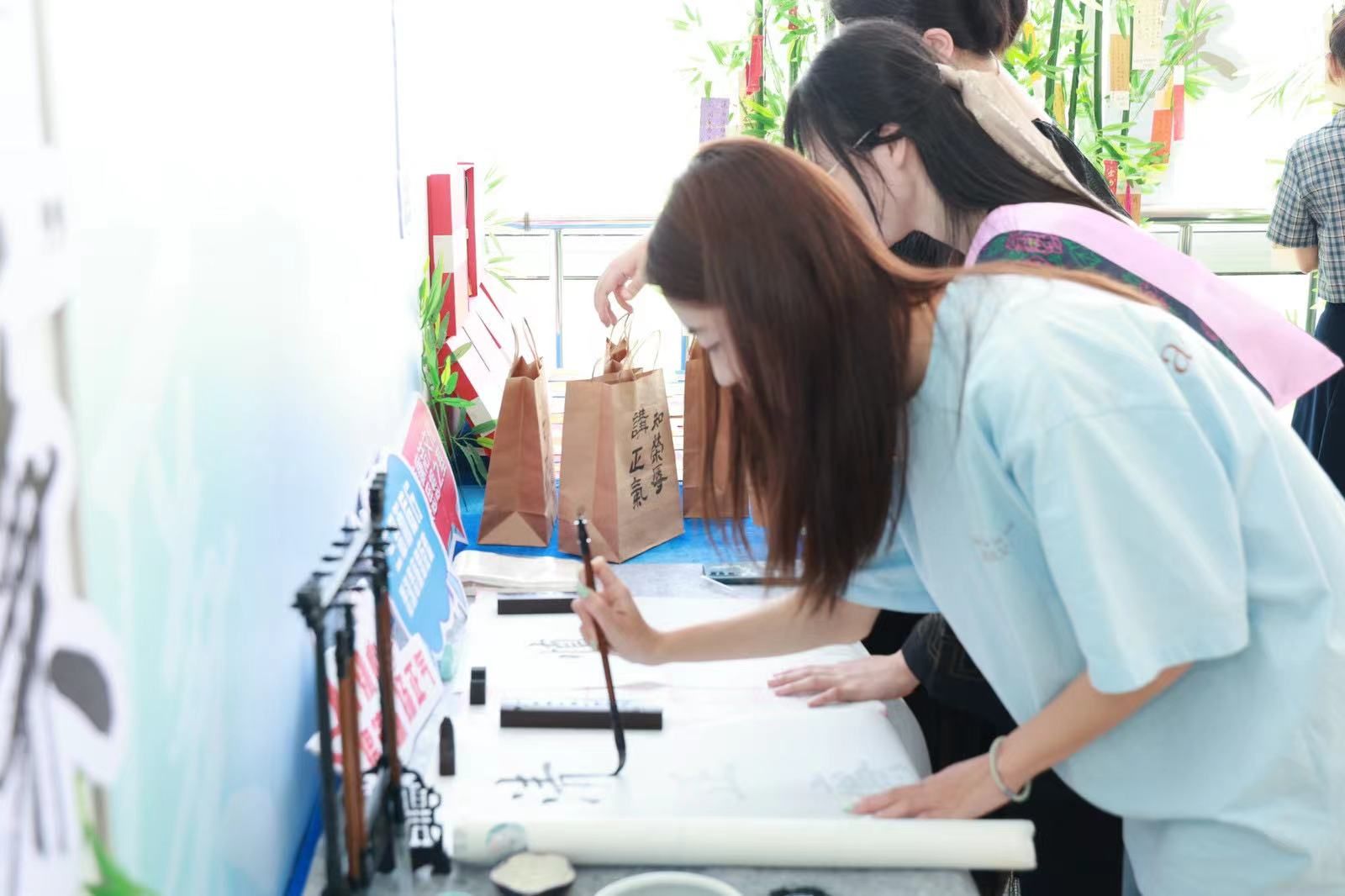 妙笔生“廉”,同学们用毛笔蘸满墨汁写下廉洁诗句、名言警局和廉洁感悟,将作品挂在展示区;