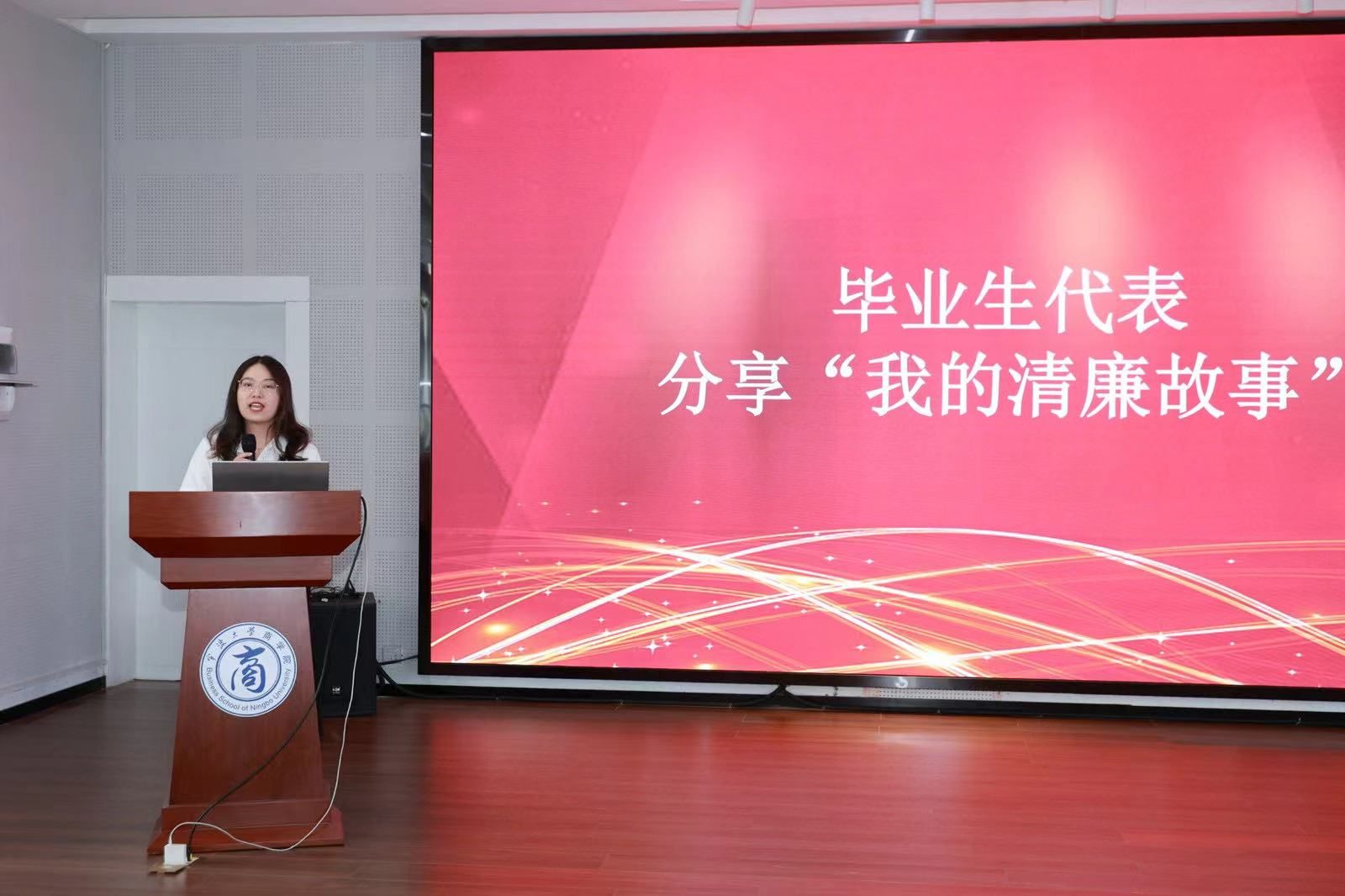 今天坐在商院501的报告厅里,看着熟悉的老师和同学们,听着陆智强老师、韩雯琛老师的讲话,大四一直在实习的我突然被真实地拉回到了校园生活中,大二时陆老师在讲台上教授成本会计的情景、韩老师给我们预备党员上党课的情景都一一浮现在我的眼前。而今天两位熟悉的老师给我们毕业生党员讲授了最后一堂课,这堂课使我更深刻地感受到了在当今社会进行反腐倡廉的必要性,对我自身的思想作风、廉洁自律、遵章守纪等方面有更大的提高。(本科生第六党支部 陈萧羽)