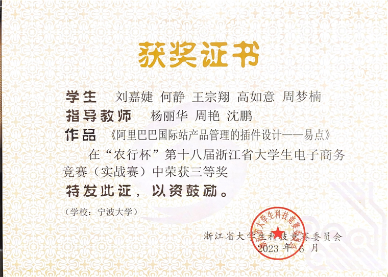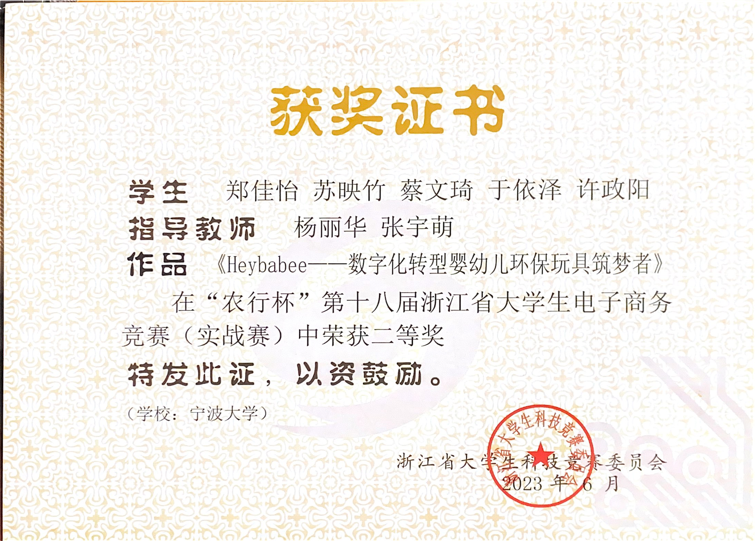 5月28日,“农行杯”第十八届浙江省大学生电子商务竞赛暨第十三届全国大学生电子商务“创新、创意及创业”挑战赛浙江省选拔赛落下帷幕。色情av影片 跨境电商微专业由杨丽华、张宇萌老师指导,郑佳怡、苏映竹、蔡文琦、于依泽、许政阳同学参与的作品《Heybabee——数字化转型婴幼儿环保玩具筑梦者》荣获跨境电商—阿里巴巴国际站赛二等奖;由杨丽华、周艳、沈鹏老师指导,刘嘉婕、何静、王宗翔、高如意、周梦楠同学参与完成的《阿里巴巴国际站产品管理的插件设计——易点》获得跨境电商—阿里巴巴国际站赛三等奖。这也是跨境电商微专业学生继首届“典阅杯”全国高校跨境电子商务综合能力大赛全国总决赛斩获佳绩后,第二次在该项赛事中获奖。