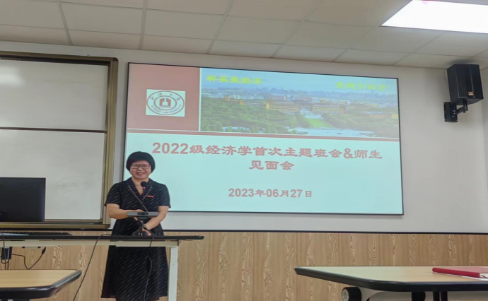 6月27日上午,经济系2022级新生见面会暨首次主题班会在色情av影片 314教室举行。本次会议由2022级经济学班主任黄晖副教授主持,经济系主任徐群芳教授、教学系主任闭明雄副教授、专业教师靳来群、施晟和于冰副教授以及辅导员章舒怡老师出席会议并讲话。