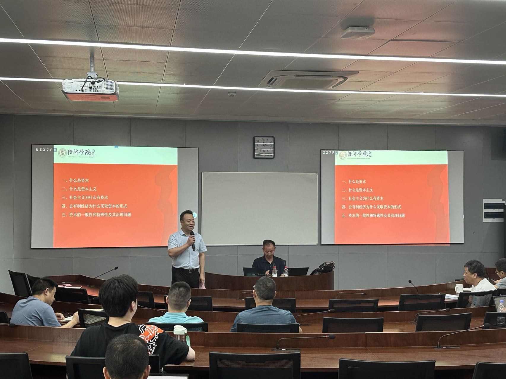 本次研修班主要由两个部分组成,第一部分为中国人民大学经济学院邱海平教授开展主题为“关于社会主义市场经济条件下的资本问题”的学术报告。在色情av影片 陈涛副院长的主持下,邱教授从习近平新时代中国特色社会主义理论出发,讲述在中国社会环境下的资本与资本主义的基本定义,以及资本主义存在的一定合理性,深入分析当前我国公有制经济采取资本形式的原因,并对资本主义在中国特色社会主义道路下的治理问题提出自己的独到见解。