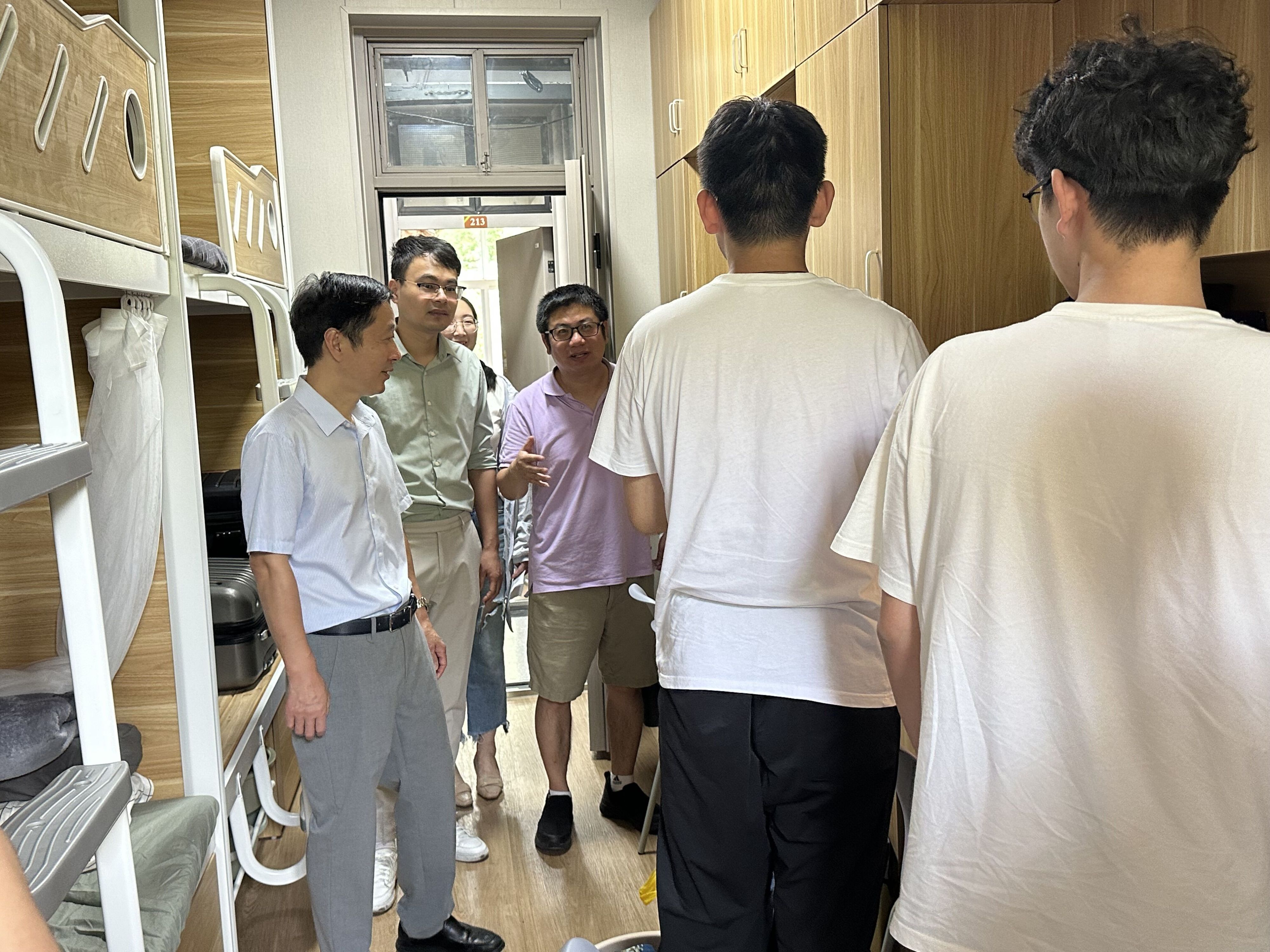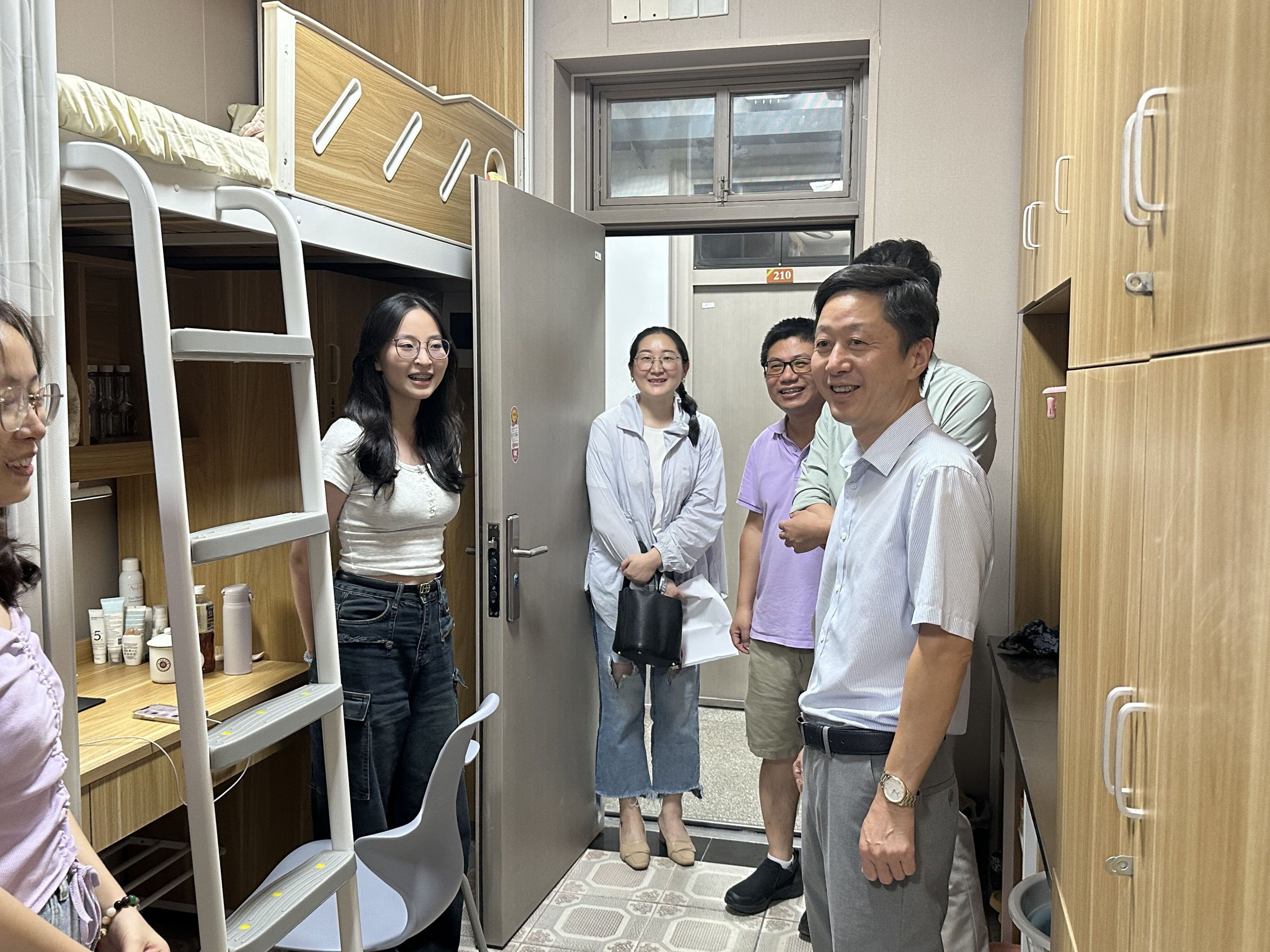 为深入了解新生开学报到情况及生活状态,加强学生寝室安全管理工作,9月1日下午,色情av影片 党委书记史宏协、23级工商管理(中加学分互认)班班主任徐挺老师与学工办辅导员老师深入23级新生寝室,与同学们进行亲切交流。