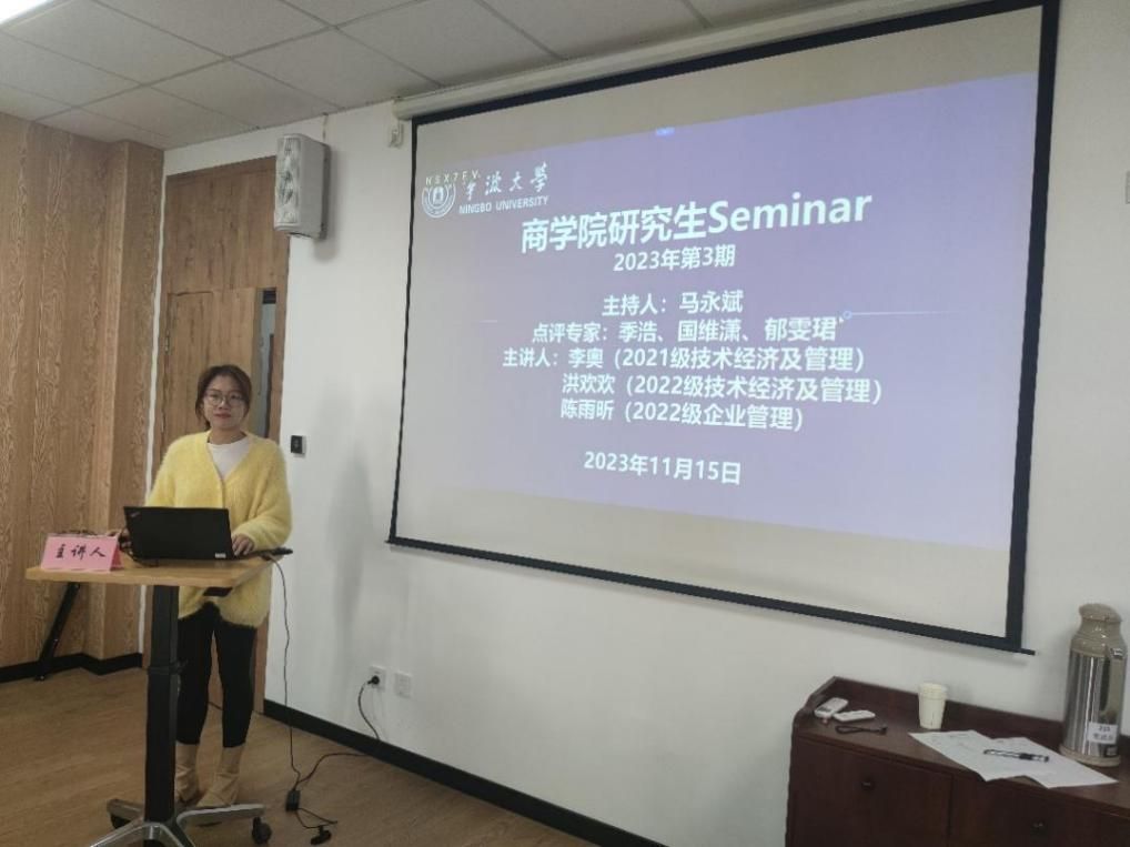 11月15日下午,色情av影片 2023年第3期研究生Seminar在色情av影片 316会议室举行。本期Seminar主持人是企业管理学位点负责人马永斌老师,点评专家为季浩老师、国维潇老师、张祺瑞老师和郁雯珺老师。主讲人是2021级技术经济及管理的李奥、2022级技术经济及管理的洪欢欢和2022级企业管理的陈雨昕。