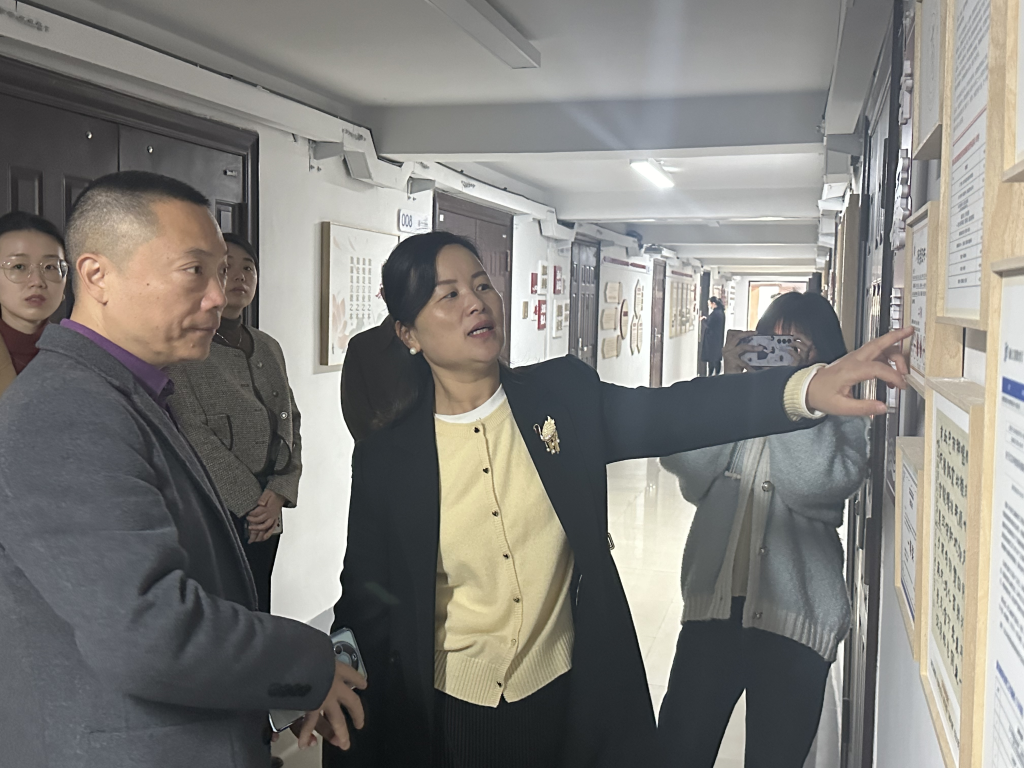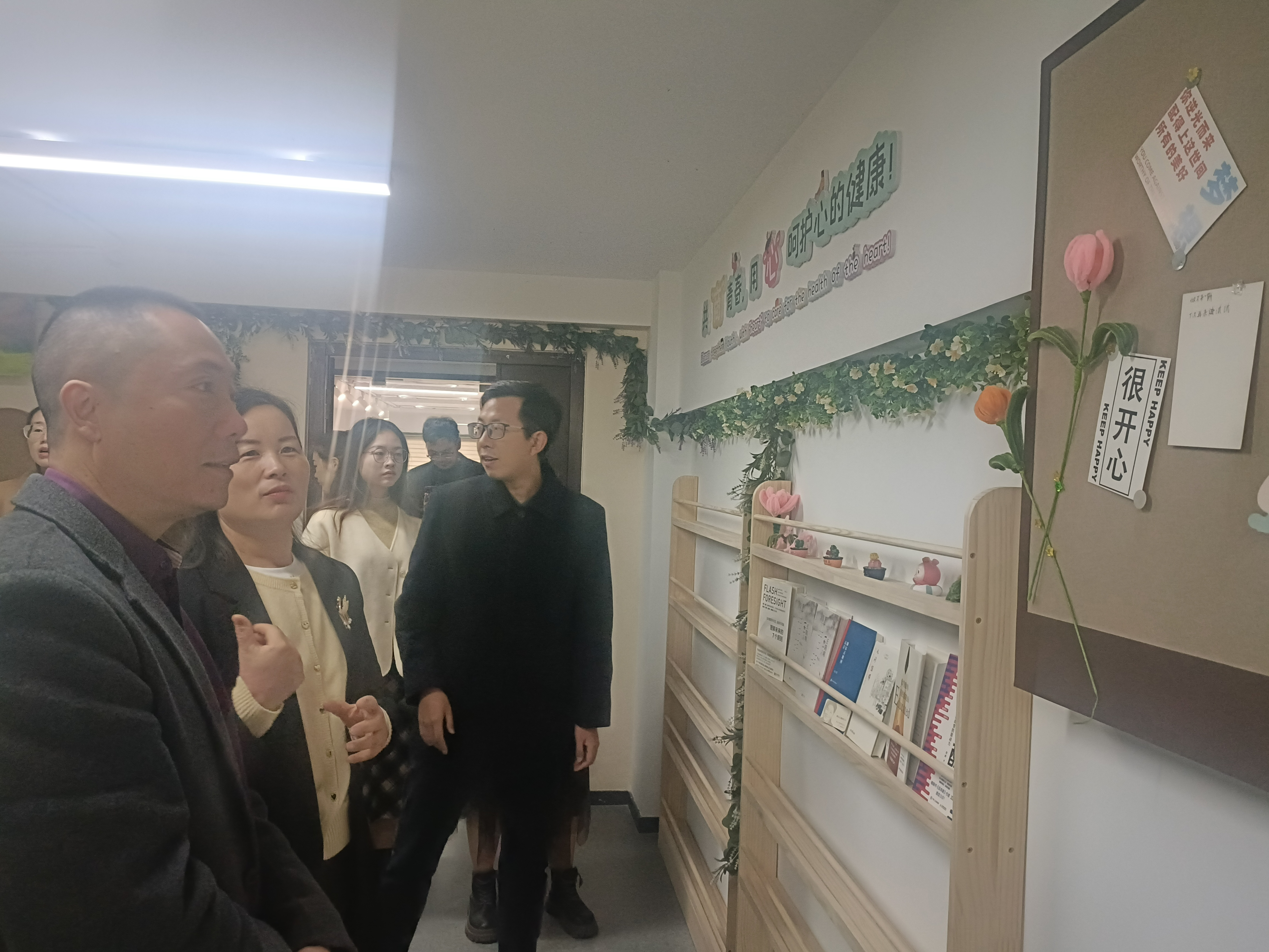 在韩雯琛的带领下,李孝明一行人参观色情av影片 “清风长廊”、共“商”青春心理工作室、共“商”未来生涯工作室、学生自习室及党员之家。