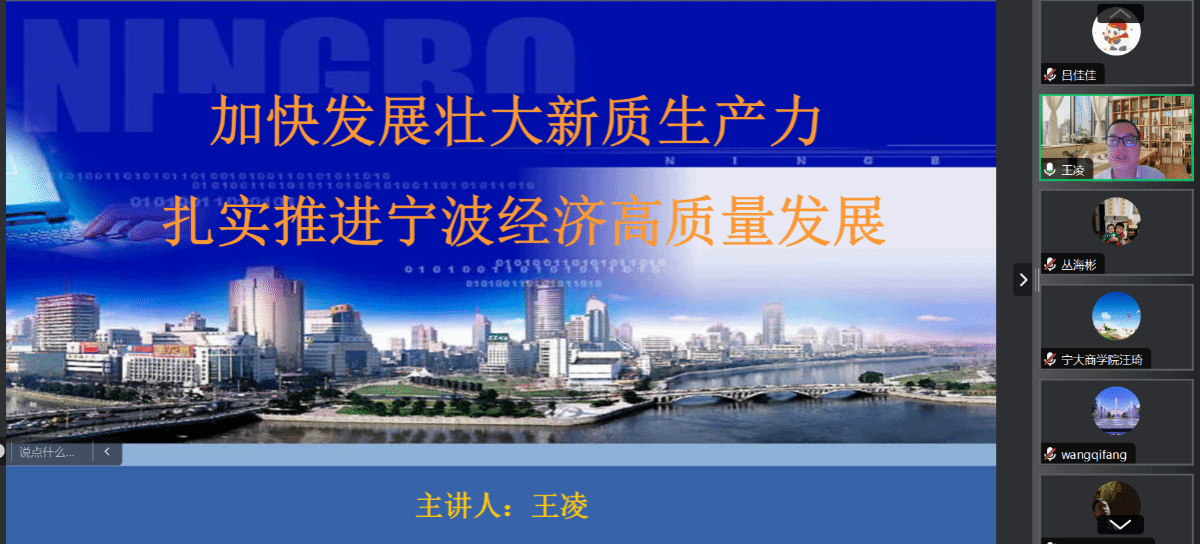 2024年5月15日,色情av影片 国际经济与贸易系2024年第2期学术沙龙在线上如期举行。为了学习贯彻习近平新时代中国特色社会主义思想,深入学习与理解新质生产力思想的需要,本次学术沙龙特邀请中共宁波市委党校经济学教研部副主任王凌教授做了题为“加快发展壮大新质生产力,扎实推进宁波经济高质量发展”的线上专题讲座。讲座由国贸系主任丛海彬教授主持,20余位教师参会。