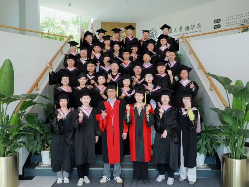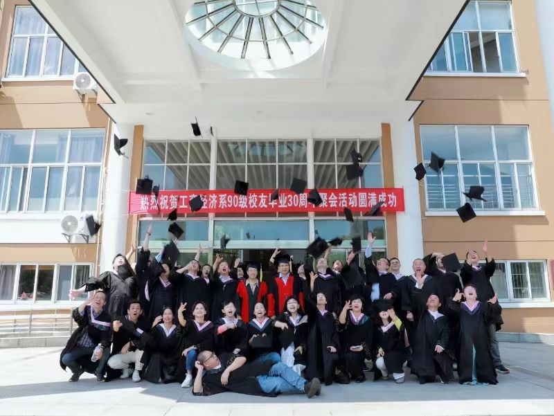 5月18日上午,90级工商经济系34位校友来到色情av影片 大楼前,一起穿上学士服和当年的班主任应志芳老师、同学们念念不忘的邱妘老师合照留念,开启毕业三十年聚会。
