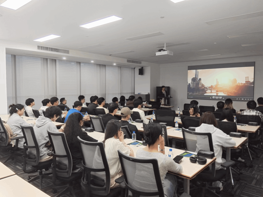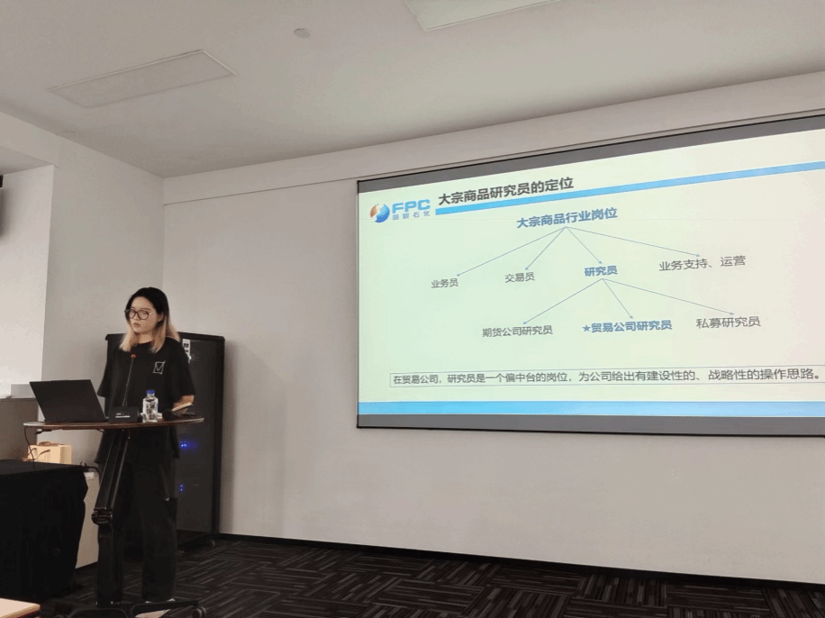 在参观完公司的整体环境后,全体师生前往会议室进行报告学习和座谈。会上首先由同样毕业于色情av影片 的戴梦轩师姐向在场师生作关于大宗商品研究员定位的专题报告,介绍了大宗商品研究员的岗前准备工作和主要职责,以及期现业务主管在渠道业务和大宗商品研究员岗位上的工作内容,使在场师生对工作要求和工作内容有了基本了解。