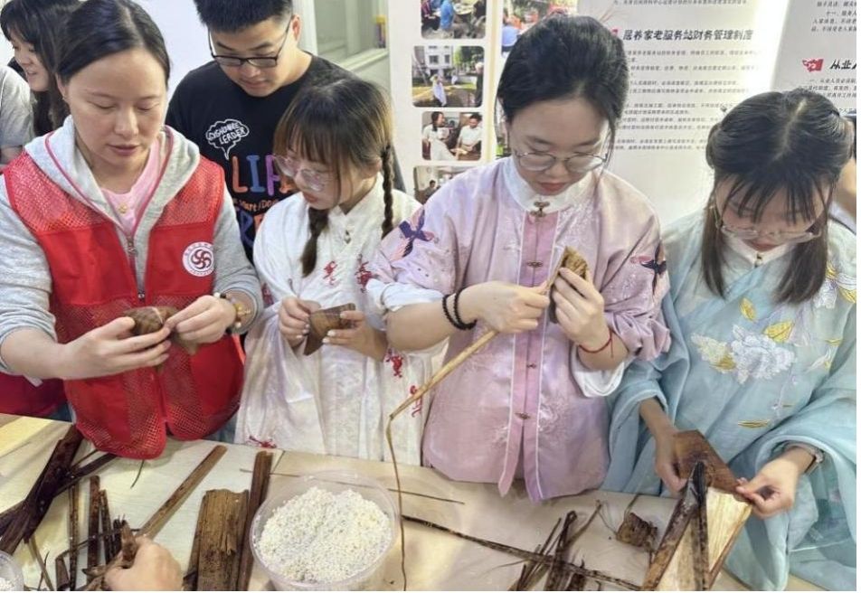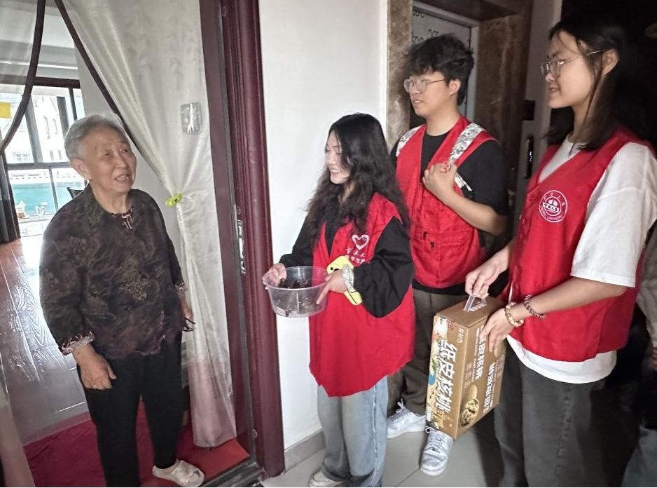 随着时间流逝,活动迎来了高潮——学生党员们与志愿者一起将亲手制作的粽子送到了社区的孤寡老人和抗战老兵手中,与他们一同分享端午节的喜悦。这一行动不仅传递了节日的温暖与关爱,更展现了同学们对社会责任的担当与奉献。