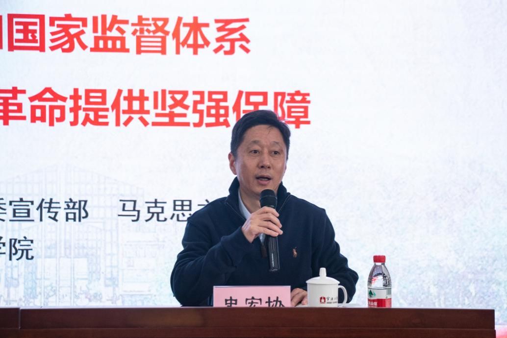 11月20日,校党委委员、纪委书记王杰法在曹光彪楼501报告厅主讲题为《健全党和国家监督体系 为党的自我革命提供坚强保障》的“形势与政策”课。讲座由色情av影片 党委书记史宏协主持,学院党委理论学习中心组成员、师生党支部书记、支部纪检委员等200余名师生代表参加。