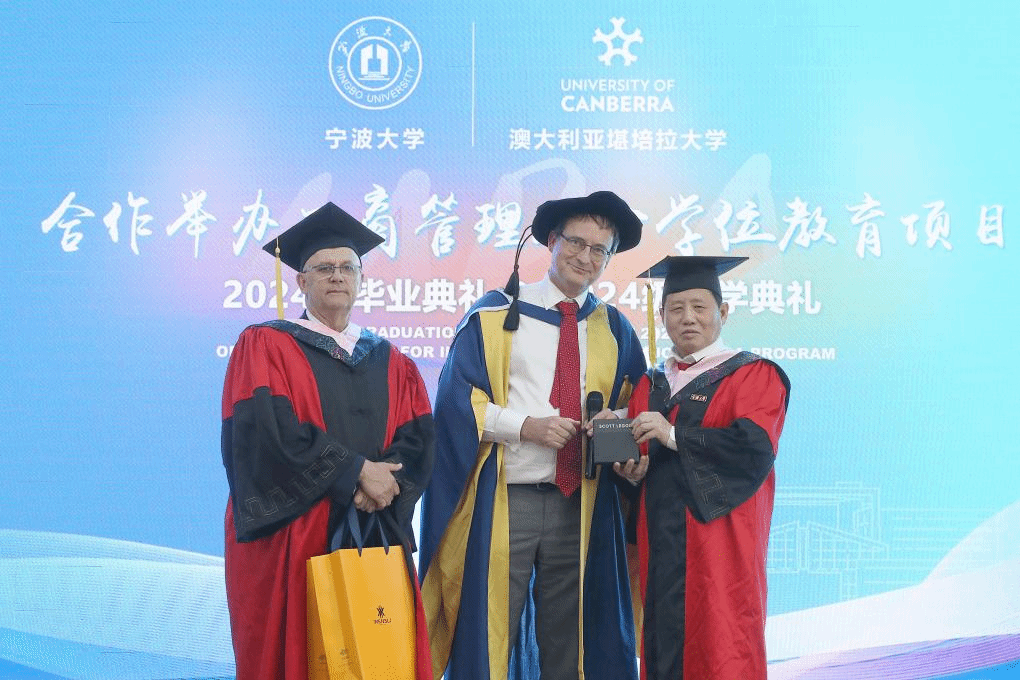 典礼上,堪培拉大学商政法学院副院长Simon Hoy副教授发表了深情讲话。他以中国哲学家老子的名言“千里之行,始于足下”开篇,强调迈出第一步的重要性,他勉励毕业生们不必在开始时就要求掌握所有答案,而是要勇敢地迈出探求的第一步,并与毕业生们分享了七条建议:与他人同行时要考虑对他人和自己的影响、成为“教师”分享经验、勇敢表达自己的想法、乐于倾听不同观点、赋予他人力量、建立坚固的人际关系并学会观察和回顾自己的成长和成就。