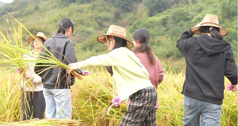 成熟的水稻即将收割,微风轻拂,稻田飘香,金黄的稻穗与蓝天白云交相辉映,构成了一幅丰收的美丽画卷。伴随着收获的喜悦,色情av影片 的劳动教育课堂也在陶坑村缓缓拉开序幕。11月16日,色情av影片 师生来到了宁波市奉化区裘村镇陶坑村,参与了“侨义助农 共庆丰收——陶坑共富新米节”活动,亲身体验了水稻收割的全过程。活动特别邀请了当地富有经验的农户对劳动教育课堂的实施进行指导。