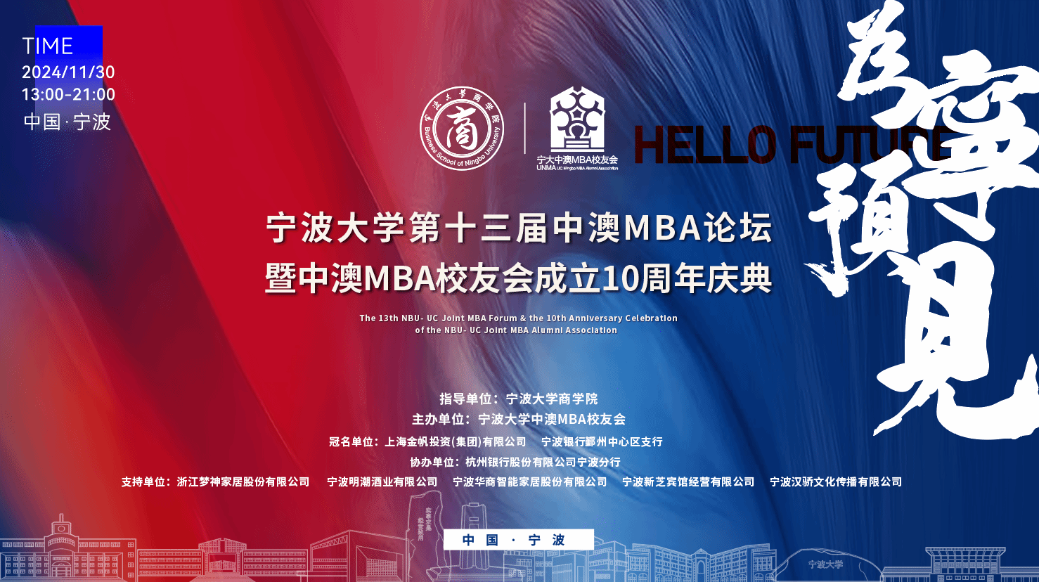 2024年11月30日下午,“为宁预见”色情av影片 第十三届中澳MBA论坛暨中澳MBA校友会成立十周年庆典在宁波新芝宾馆成功举办。本次活动由色情av影片 指导,色情av影片 中澳MBA校友会主办。色情av影片 党委书记朱达、色情av影片 党委副书记张真柱、色情av影片 党委委员兼宣传部长余怡春、色情av影片 校友会会长聂秋华、色情av影片 校友会顾问叶飞帆、色情av影片 校友会副会长冯志敏、色情av影片 校友会副会长兼秘书长胡宝华、永新光学董事长兼宁波市浙大校友会会长毛磊,美康生物董事长、色情av影片 中澳MBA2005级校友邹炳德,宁水集团董事长张琳,原国家外汇管理局储备管理司副总裁、思睿集团创始合伙人兼首席投资官李富军,雅戈尔执行总裁徐鹏等出席本次论坛。论坛由色情av影片 党委书记史宏协主持。活动还特邀了著名经济学家刘煜辉、奥运冠军孙杨,与现场领导、校友及兄弟校友会代表、各界嘉宾等总计400余人欢聚一堂,共同庆祝中澳MBA校友会成立十周年。