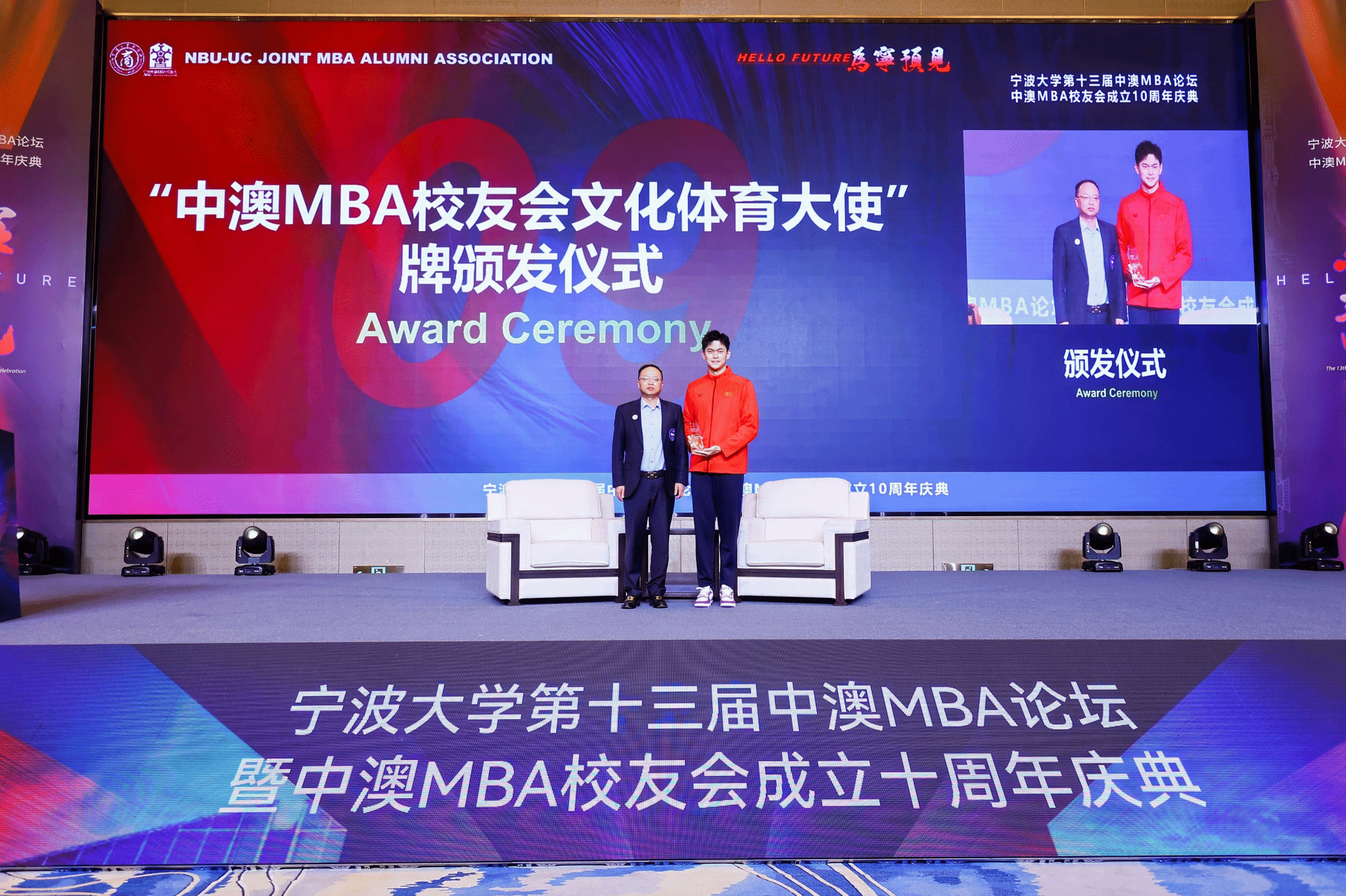 接下来,在现场全体嘉宾和校友们共同见证下,色情av影片 中澳MBA校友会会长汪新宇先生向著名游泳健将、奥运冠军孙杨先生颁发了“色情av影片 中澳MBA校友会文化体育大使”的表彰牌。随后,色情av影片 党委副书记吴敏主持并邀请孙杨作体育和商业主题分享,与众人共同探讨体育在推动经济增长、促进社会进步方面的多维度价值。他首先结合宁波本地制造业、外贸产业发达,GDP发展迅速的特点,认为色情av影片 具有人才储备充足的优势,期待与校友们共同在体育事业方面创造更多就业机会。接下来,他以大型体育赛事的经济影响为切入点,探讨奥运会、世界杯等赛事如何推动举办地的经济增长,提出要利用好赛后场馆,实现运营化、数字化、科学化管理。实现传统体育破圈,让体育产业走进学校,拓宽未来发展空间,实现体育事业的智能迭代。最后,他讲述了自己今后的计划是走进校园、开展体育活动,同时类比企业和体育竞技,都要秉承奥运精神,突破困难,穿越周期。吴敏副书记也祝愿今后色情av影片 能与孙杨先生有更多深度的合作。