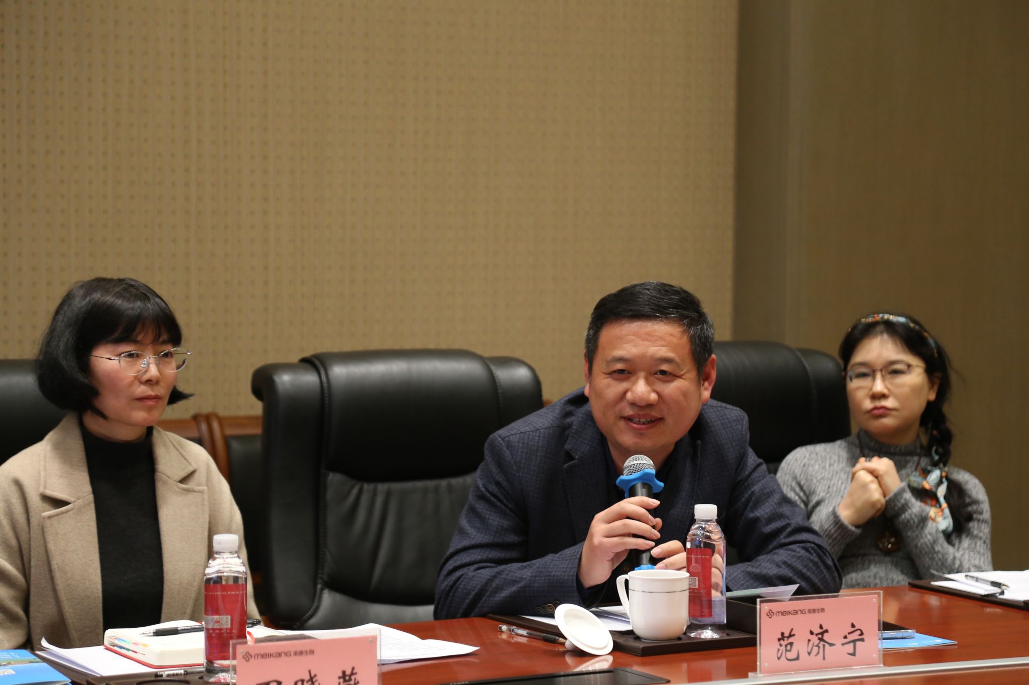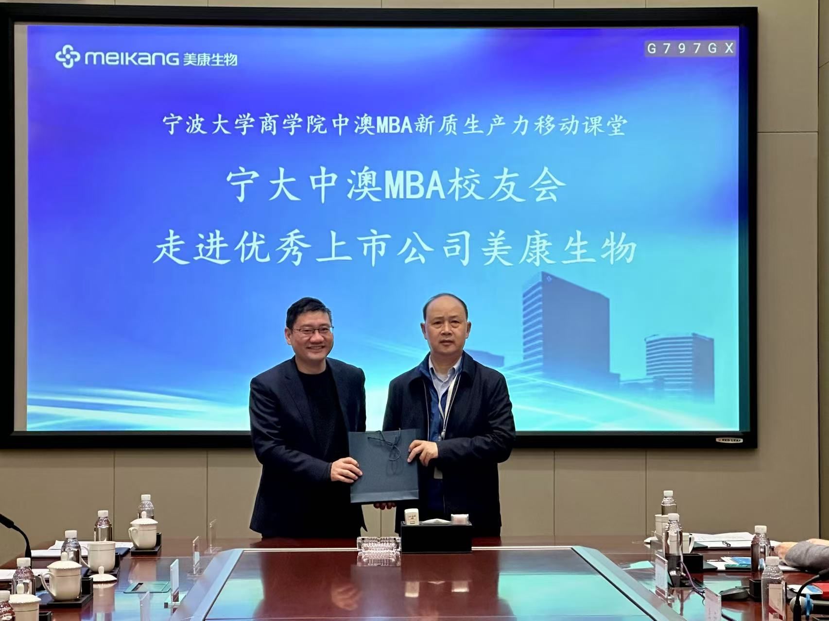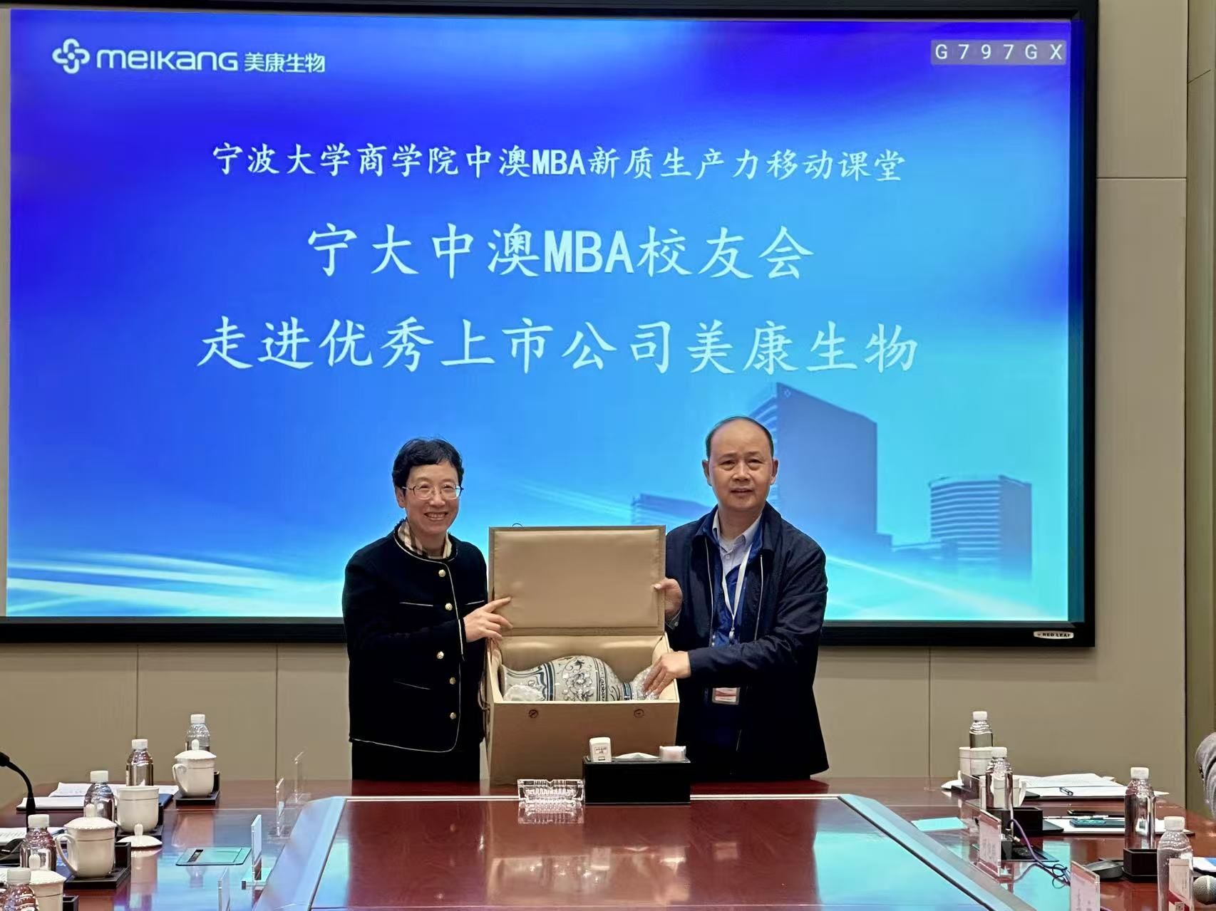 交流结束后,彭新敏副院长代表色情av影片 ,邱妘教授代表色情av影片 中澳MBA校友会分别向美康生物送上了精心准备的感谢礼品。全体参会人员在公司一楼大厅内进行了合影留念,为此次活动留下了珍贵的记忆。