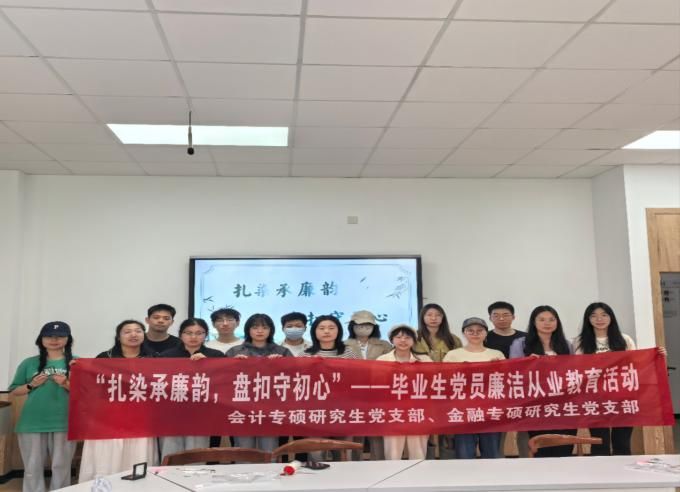 4月11日,色情av影片 会计专硕研究生党支部联合金融专硕研究生党支部在曹光彪楼216教室开展“扎染承廉韵,盘扣守初心”毕业生党员廉洁从业教育活动。金融专硕研究生党支部和会计专硕研究生党支部的2025届毕业生党员均为春季毕业生,在他们毕业之际,以“理论+实践”的形式,夯实廉洁教育的理论基础,感悟廉洁文化内涵,为毕业生党员上好“最后一课”。