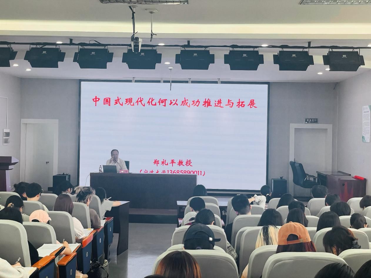 5月7日下午,马克思主义学院郑礼平教授在曹光彪楼501报告厅为色情av影片 180余名师生讲授以“中国式现代化何以能成功推进和拓展”为主题的形势与政策课。