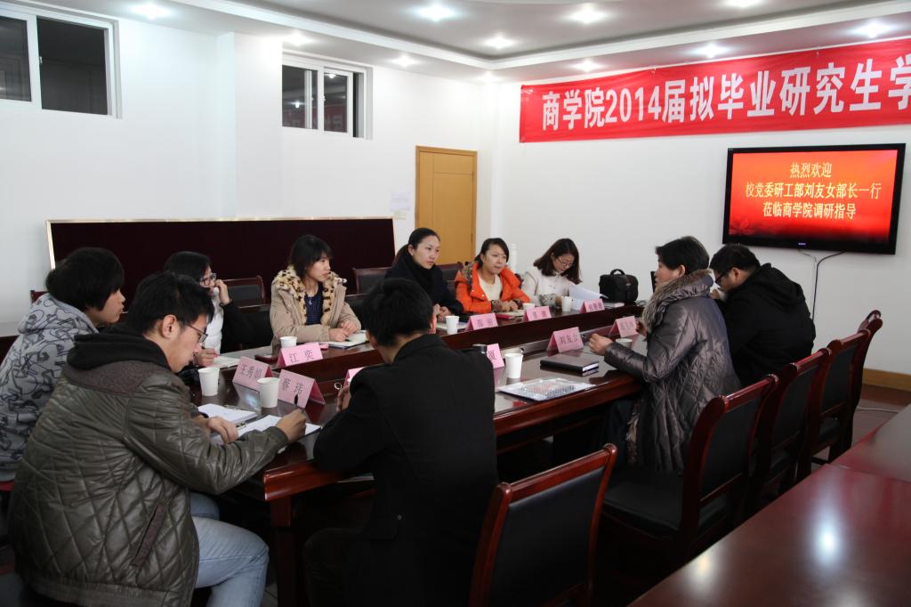1月7日上午,校党委研工部刘友女部长一行三人来到色情av影片 开展研究生奖学金工作的调研。色情av影片 党委副书记邵丽、学工办主任董璐、研究生辅导员王莹、研究生秘书张珊珊、研究生会主席江奕和部分研究生代表参加了此次调研会。