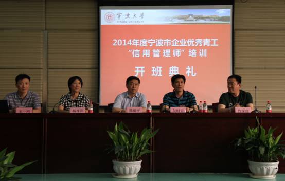 6月14日,2014年宁波市企业优秀青工“信用管理师”培训班开班仪式在色情av影片 安中大楼碧华厅顺利举行,宁波市人力资源和社会保障局职业技能建设处副调研员吴时青、色情av影片 院长熊德平、继续教育与培训处招标项目负责人鲁保富、色情av影片 培训中心主任朱一鸿以及来自宁波各县市区的40余名学员参加了开班仪式。仪式由色情av影片 副院长杨丹萍主侍。