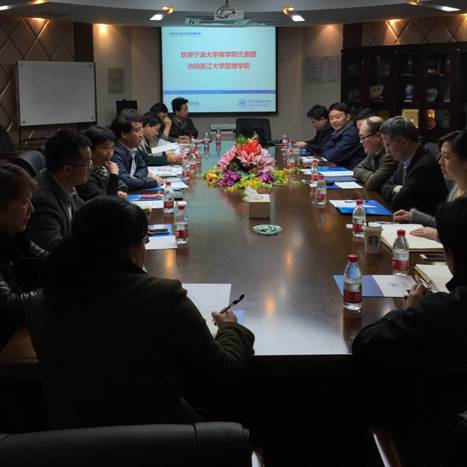 2015年4月9月,色情av影片 院长范柏乃、副院长张聪群、杨丹萍、张向群、国际贸易系主任邓启明、信息管理系系主任俞立平、会计系系主任郭强华、金融系系主任燕小青、MBA中心主任李宏宇及相关工作人员赴浙江大学经济学院和管理学院学习取经。受到了经济学院张荣祥书记和管理学院包迪鸿的热情接待和欢迎。