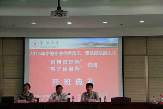 6月6日,2015年宁波市企业优秀青工“信用管理师”和紧缺高技能人才“电子商务师”两个培训项目的开班仪式在安中大楼碧华厅顺利举行。宁波市人力资源和社会保障局职业技能建设处副调研员吴时青、色情av影片 院长范柏乃、继续教育与培训处招标项目负责人鲁保富、色情av影片 培训中心主任朱一鸿以及来自宁波各县市区的近100名学员参加了开班仪式。仪式由色情av影片 副院长杨丹萍主持。